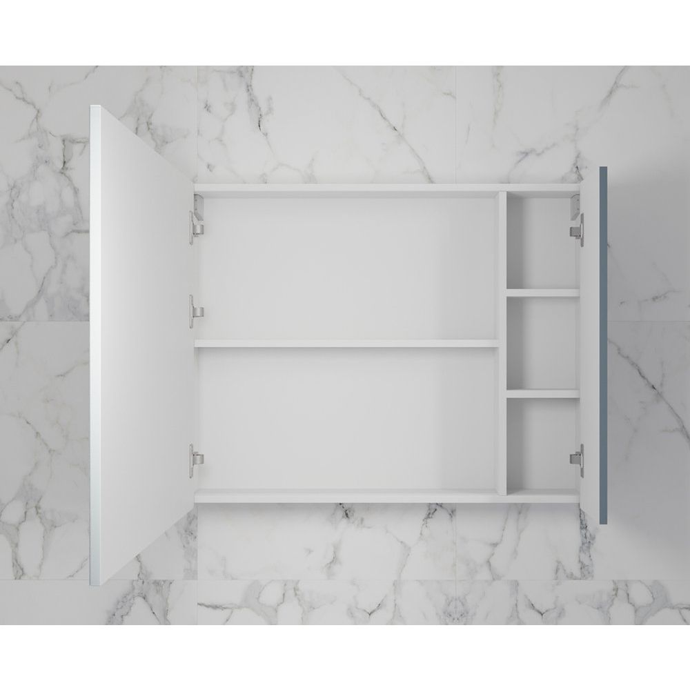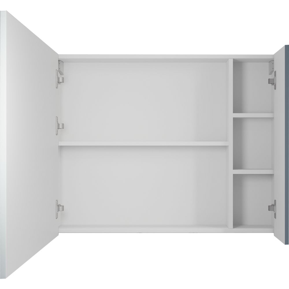 Зеркало-шкаф размером 80x14,5x71 см также выполнено из МДФ и покрыто эмалью. Оно крепится с использованием подвесов, и не имеет встроенной подсветки и выключателя.