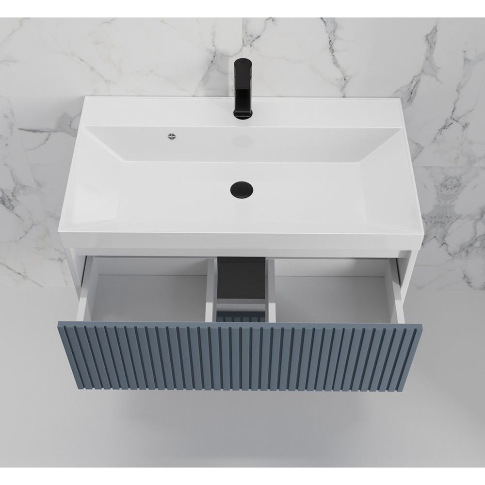 Тумба для комплекта обладает размеров 80,2x44,7x55 см и выполнена из прочного МДФ, покрытого пленкой. Подвесная конструкция с доводчиками обеспечивает удобство использования и долговечность. Ящики открываются с помощью нажимного механизма.