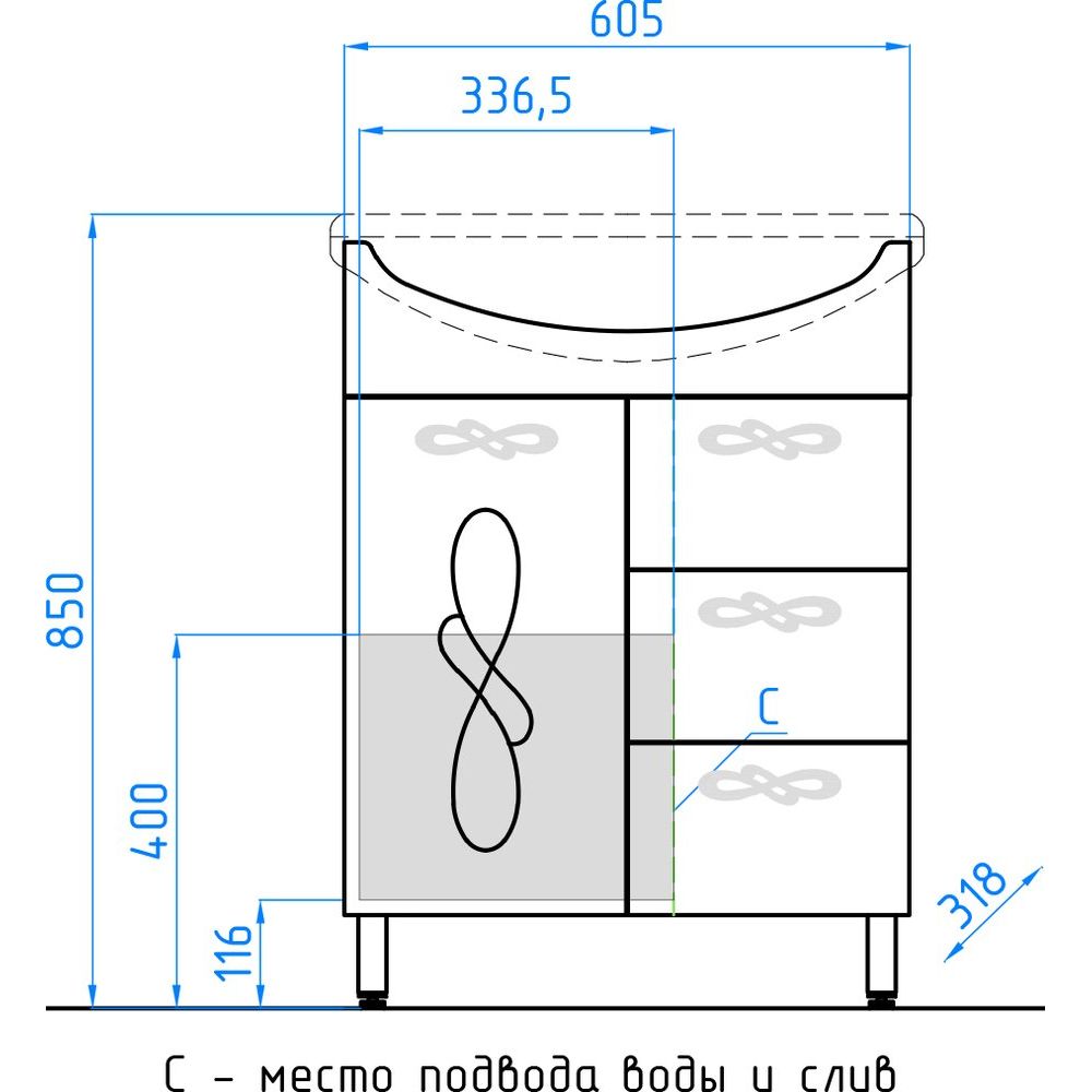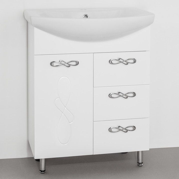 Тумба для комплекта Style Line Венеция 65: имеет размеры 60,5x31,8x85 см, напольная конструкция, оснащена механизмом доводчика для плавного закрывания. Изготовлена из ЛДСП с ламинатным покрытием, фасад из МДФ с пленочным покрытием, хромированная фурнитура. Гарантия 1 год, производство — Россия.