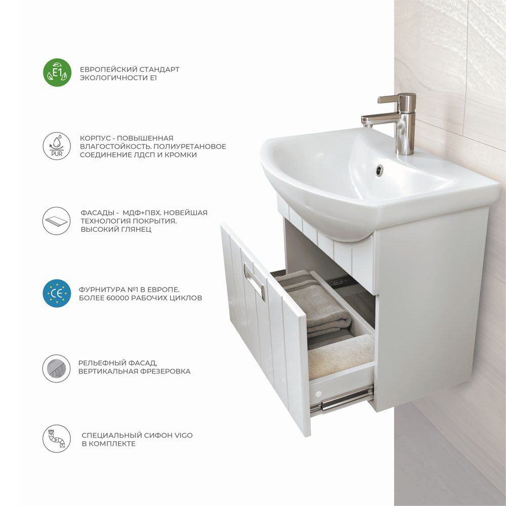 Тумба гарнитура Vigo Diana 60 имеет габариты 56x31,6x48,3 см. Это подвесной элемент с одним ящиком, выполненный из ЛДСП с ламинатным покрытием для защиты от влаги. Фасад из МДФ дополнен пленочным покрытием, а хромированная фурнитура придаёт изделию особый шарм. Оснащён направляющими полного выдвижения и встроенным механизмом доводчика для плавного закрывания. В комплект включён сифон, однако для установки донного клапана потребуется его замена. Гарантия 2 года подтверждает надежность изделия.