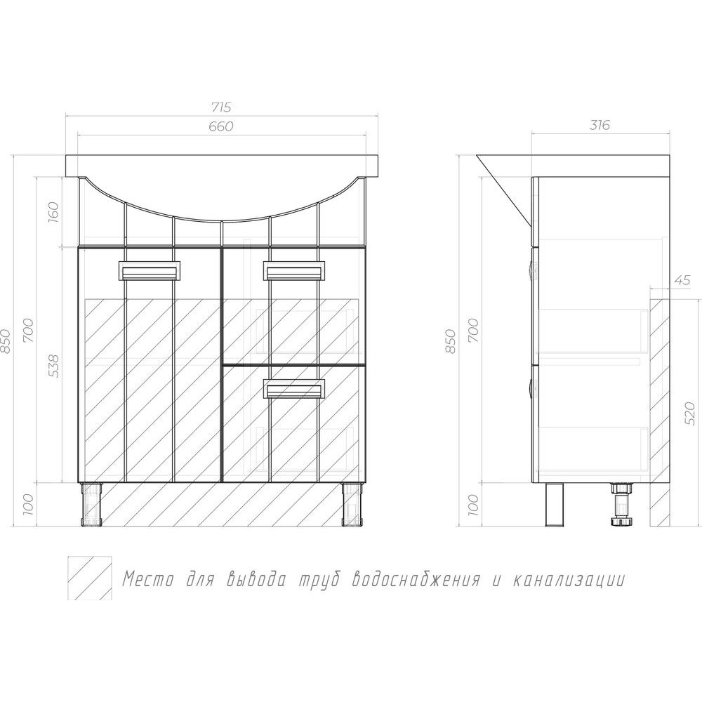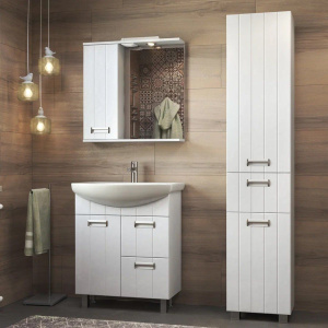 Комплект состоит из тумбы, предусмотренной для установки на полу, с габаритами 66x31,6x80 см. Корпус мебели покрыт ламинатом, что защищает её от влаги и повышает износостойкость. Фасады из МДФ оформлены пленкой, а хромированная фурнитура добавляет современности общему дизайну. Раковина изготовлена из прочного фарфора, ее размер составляет 71,5x44,3 см, и она рассчитана на сифон диаметром 3.2 см. Зеркало с электровыключателем и доводчиком имеет размеры 70,5x15,6x70 см, что делает его идеальным для средних и больших ванных комнат.