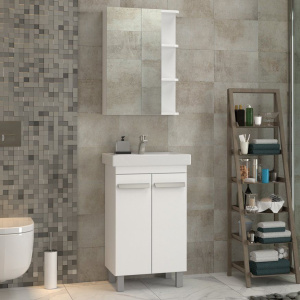Тумба Vigo Nova 50 имеет размеры 46,2x35,6x80 см и выполнена из ЛДСП с ламинатным покрытием, способным выдержать влажные условия ванной комнаты. Материал фасада — МДФ, что придаёт изделию дополнительную прочность и стильный внешний вид. В комплект включены съемные внутренние полки и сифон. Покупка также включает раковину Santek Тигода 1WH302128 50 с габаритами 50,6x38 см из высококачественного фарфора. Она оснащена встроенным слив-переливом и готова к установке смешителя. Завершает комплект зеркало-шкаф Vigo Nova 50 с доводчиком дверок и габаритами 50,1x15x70 см.