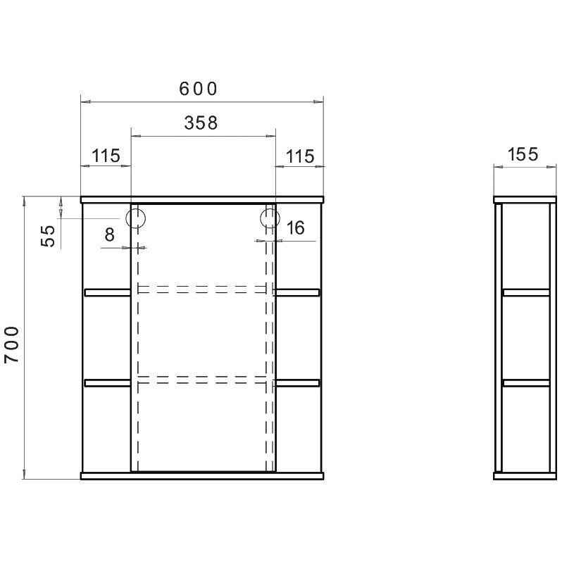 Тумба Vigo Nova 60 имеет габариты 56,4x43,4x80 см, оснащена съемными полками и выполнена из ЛДСП с ламинатным покрытием. Раковина Santek Миранда размером 60x45 см изготовлена из фарфора и имеет одно отверстие под смеситель. Зеркало-шкаф с механизмом доводчика для плавного закрывания имеет размеры 60x15,5x70 см и также изготовлено из ЛДСП с ламинатным покрытием.