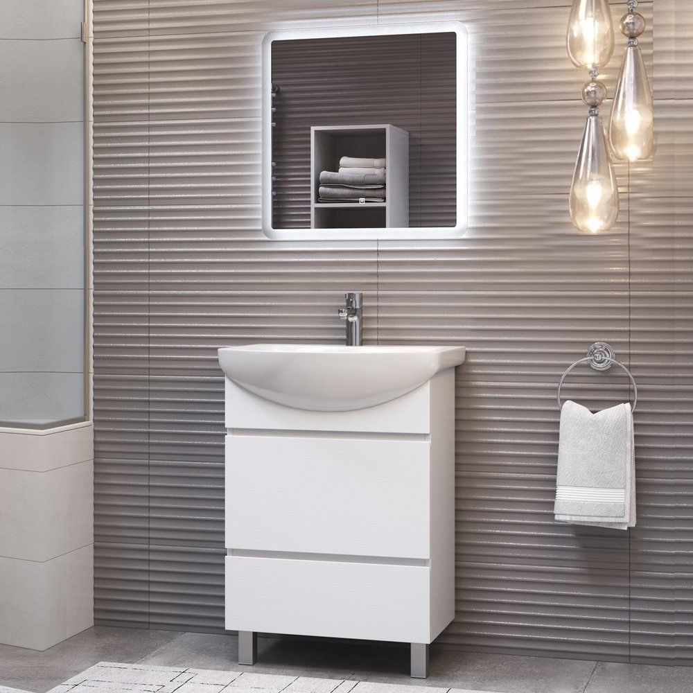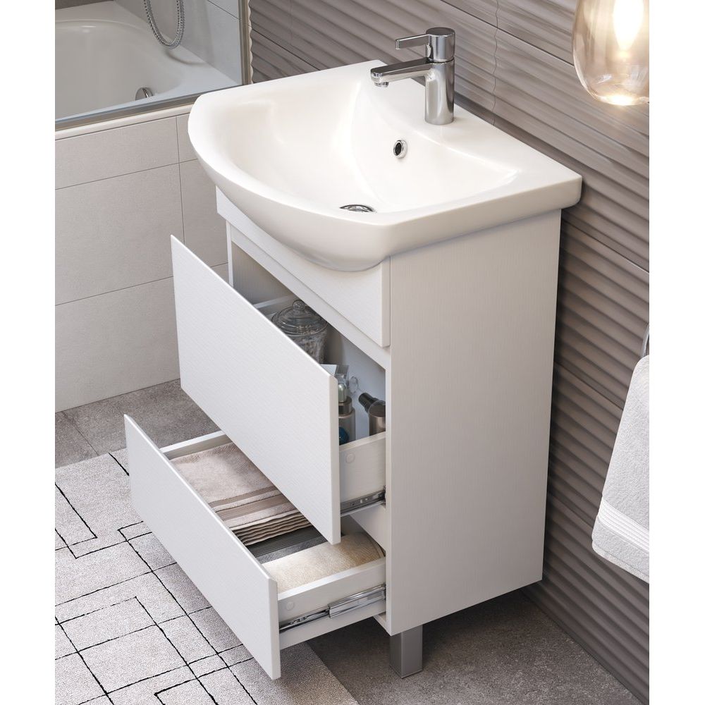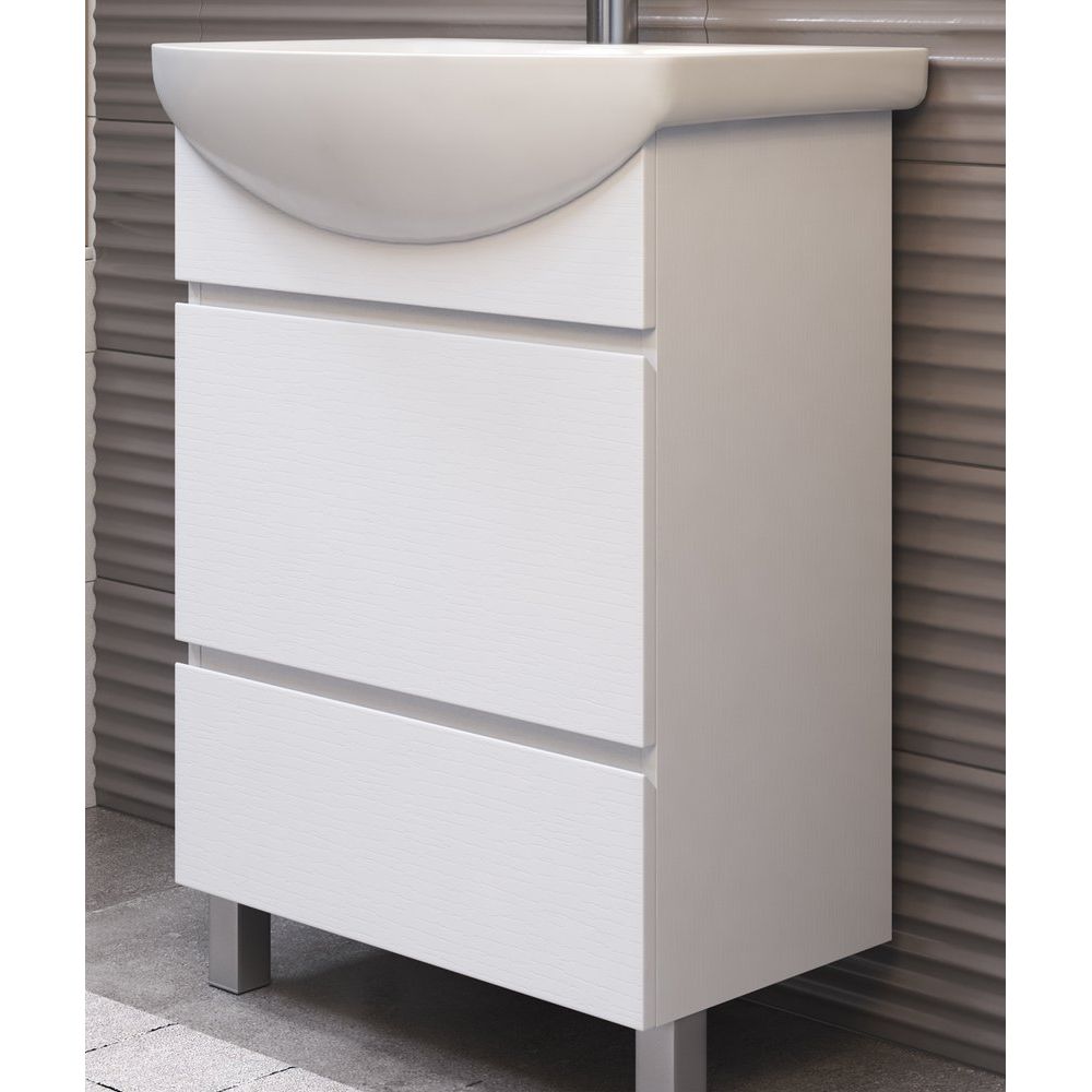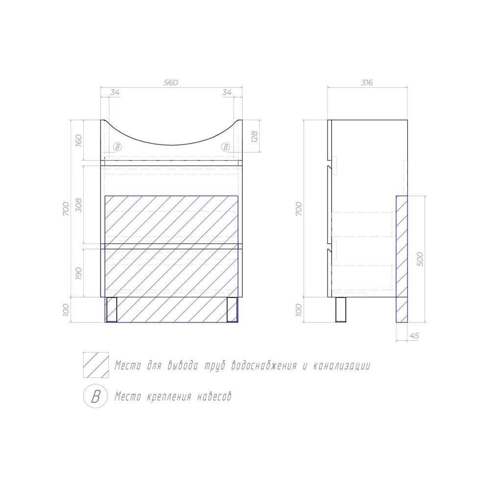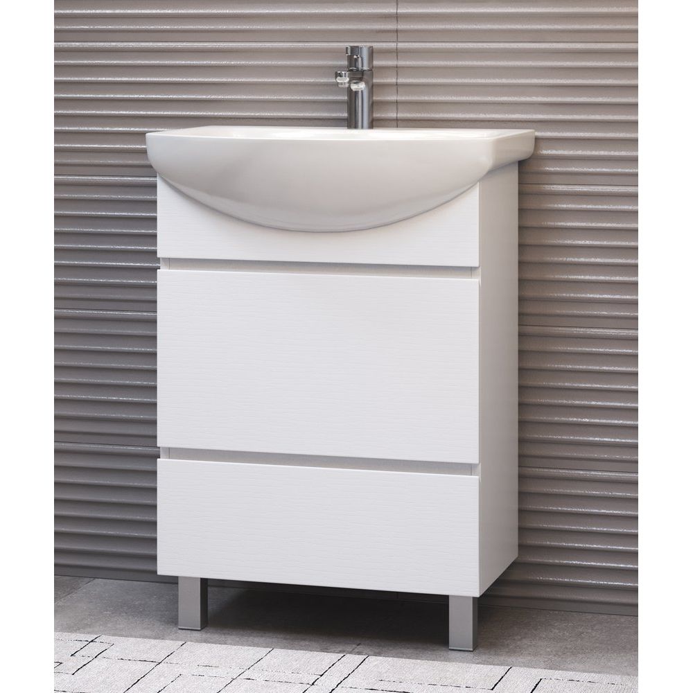 Основной элемент комплекта — напольная тумба Vigo Wing 60, имеющая габариты 56x31,6x80 см. Корпус и фасад выполнены из ЛДСП и облицованы ламинатом, что делает их устойчивыми к влаге и физическим нагрузкам. Ящики открываются легко, но без механизма доводчика.