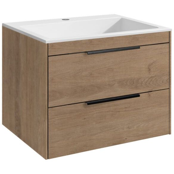 Тумба с подвесной установкой имеет размеры 59,2x47,6x47,5 см. Она выполнена из ЛДСП, обработанного ламинатом, что обеспечивает долговечность и устойчива к влаге. Цвет черной фурнитуры подчеркнёт современность вашего интерьера, а ящики оснащены механизмом доводчика для плавного закрывания.