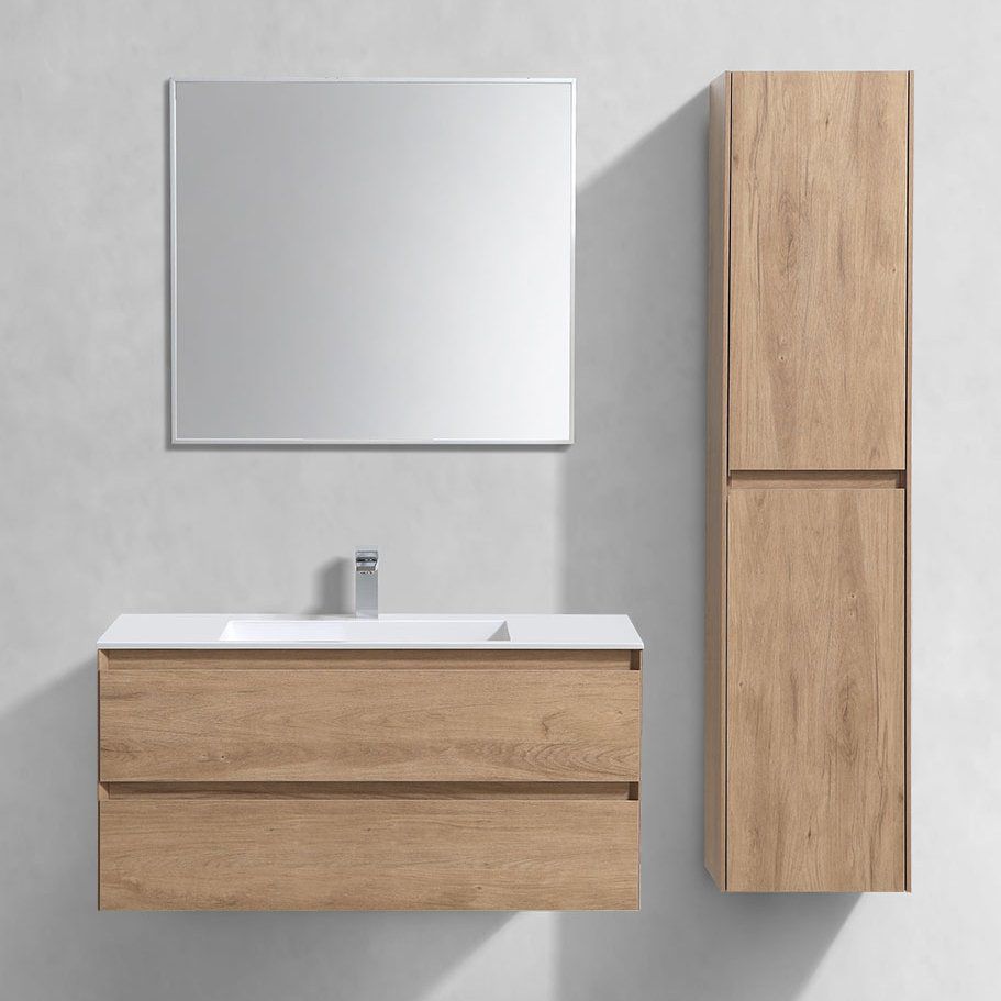 Мебель для ванной включает в себя подвесную тумбу Vincea Luka с размерами 99x47,6x47,5 см в стиле натурального дуба. Изготовлена из ЛДСП с ламинатным покрытием для корпуса и фасада, что делает её прочной и эстетически привлекательной. Два выкатных ящика оснащены системой soft-close для плавного закрывания.