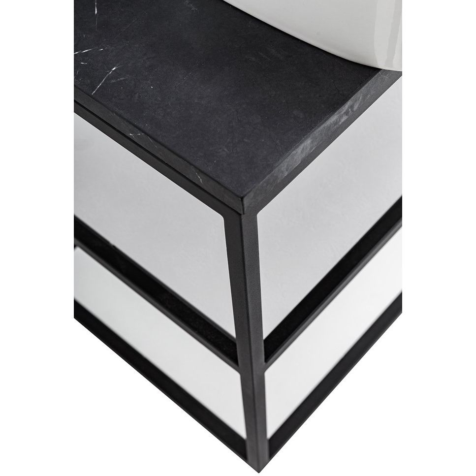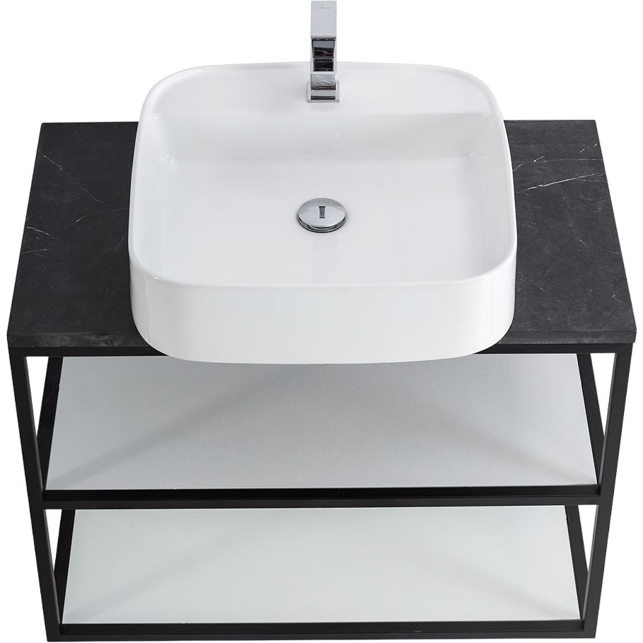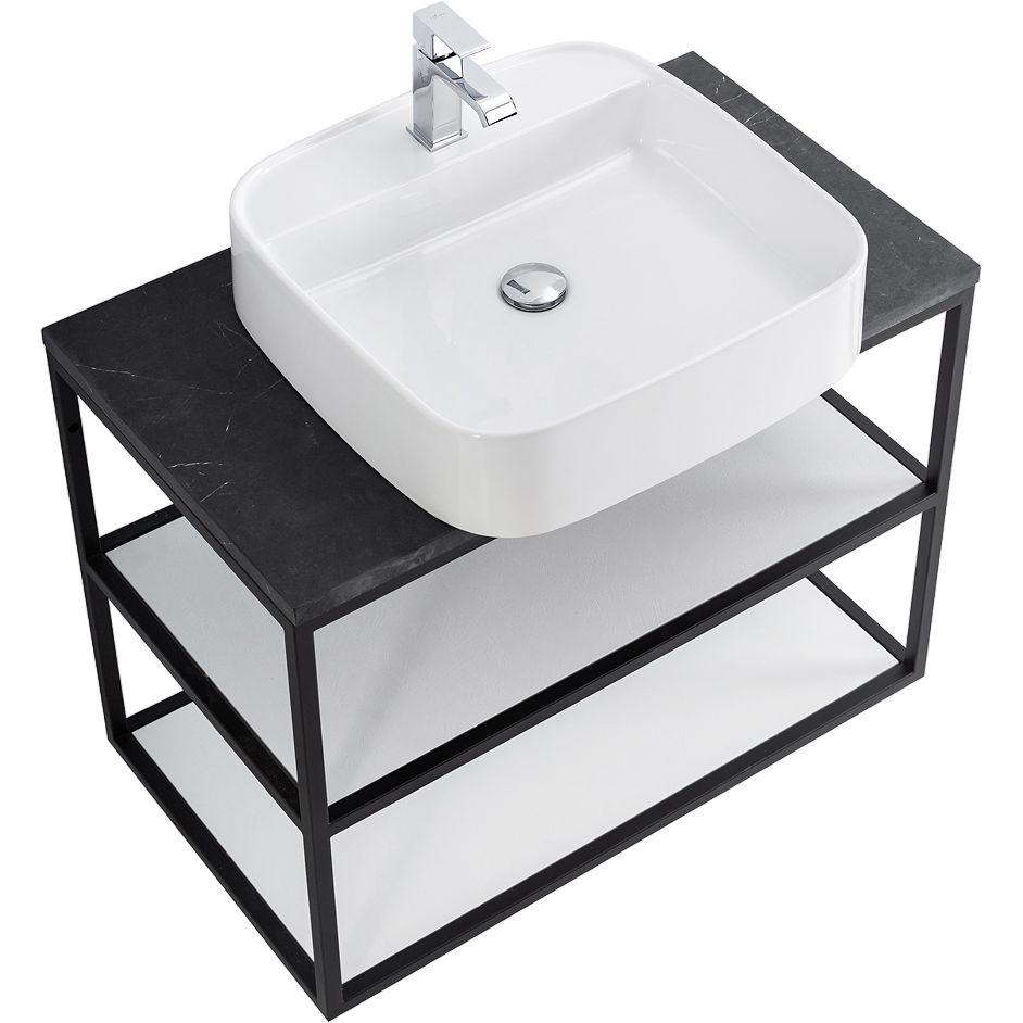 Консоль для раковины обладает габаритами 80x46x58 см и выполнена из прочной стали с эмалированным покрытием. Комплектуется столешницей из керамогранита размером 80x46x2 см в элегантном черном цвете и раковиной 60x42 см из фаянса, выдерживающей до 25 лет использования. Раковина имеет отверстие для смесителя диаметром 3.2 см, донный клапан не входит в комплект и приобретается отдельно. Нижняя полка из ЛДСП с покрытием из плёнки имеет размеры 75.7x41.7x1.6 см и органично встраивается в общий дизайн. Все элементы произведены в Италии, что говорит о высоком качестве продукции.