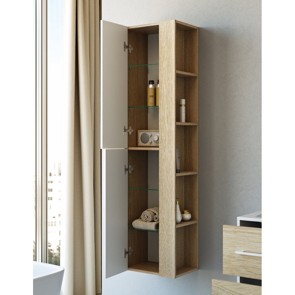 Габариты шкафа-пенала составляют 40x30x158,5 см, что делает его отличным компаньоном в любом пространстве. Подвесной дизайн обеспечивает легкость установки и отсутствие контакта с полом. Отличается механизмом плавного закрывания дверей, а фасад объединяет эмаль и ламинат, что позволяет ему идеально вписаться в ваш интерьер. Несъемные полки доступны для организованного хранения, а поставка в собранном виде избавляет от сборки.