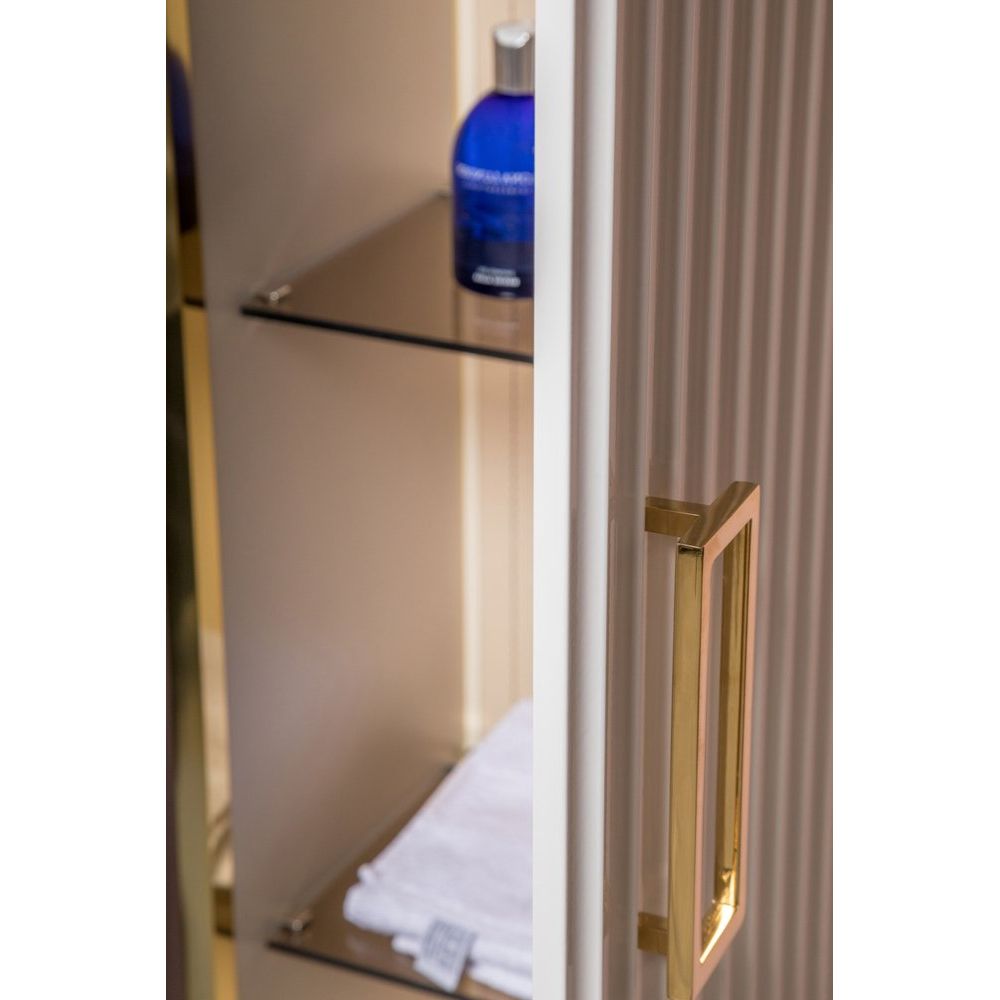 Этот подвесной шкаф-пенал имеет габариты 35x30x148 см, что делает его идеальным выбором для компактных и стильных ванных комнат. Корпус и фасад выполнены из МДФ с алюминиевыми элементами и покрыты эмалью для долговечности и устойчивости к внешним воздействиям. Золотая фурнитура подчёркивает роскошный стиль коллекции Monaco. Внутри шкаф оснащён съёмными полками, позволяющими оптимально организовать пространство хранения.