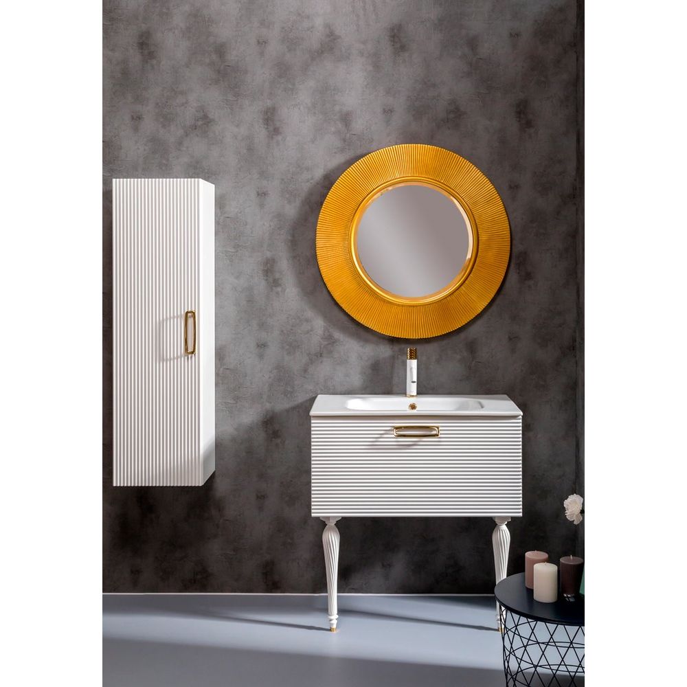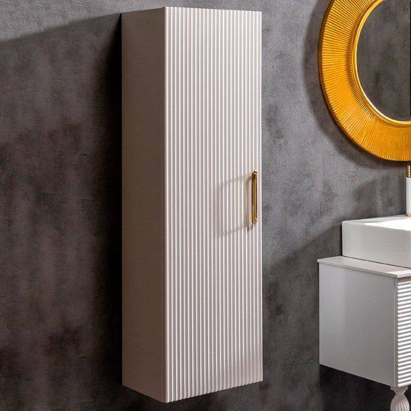 Шкаф-пенал имеет размеры 35x28,5x120 см и является подвесным, что позволяет легко вписать его в пространство ванной комнаты. Корпус и фасад изготовлены из прочного МДФ с акриловым покрытием, что гарантирует защиту от влаги и сохранение цвета. Золотая фурнитура придает изделию особый шарм и благородство.