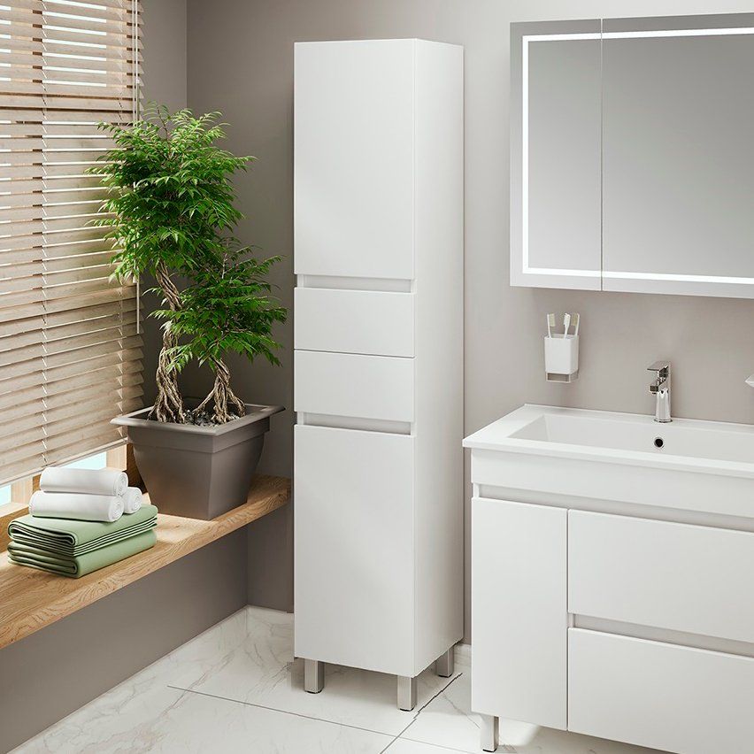 Шкаф-пенал имеет размеры 40x32x190 см, что делает его компактным, но весьма вместительным вариантом для любой ванной комнаты. Выполнен из МДФ с пленочным покрытием, что обеспечивает долговечность и современный вид. Подвесная конструкция с ножками усилена дополнительной опорой для стабильности, а механизм доводчика гарантирует плавную и тихую работу дверок и ящиков. Эта модель производится в России и имеет годовую гарантию.