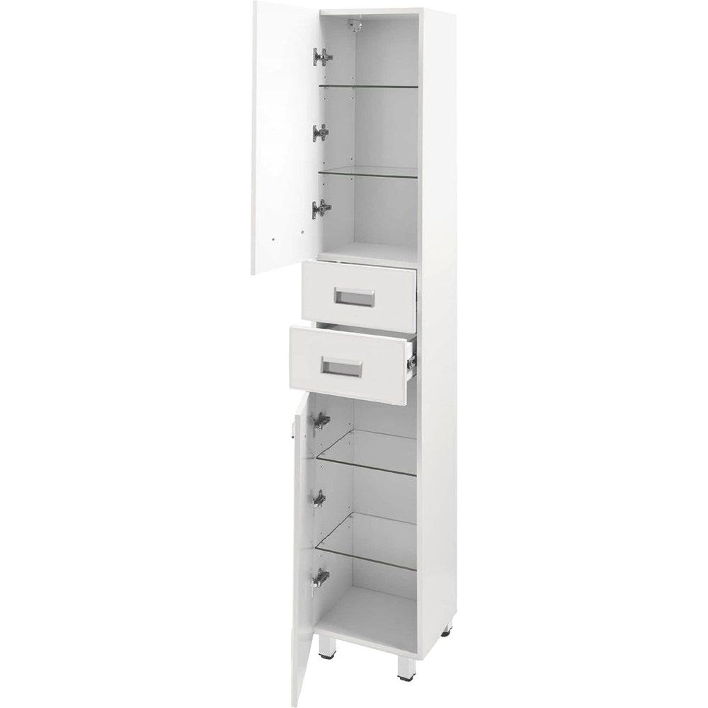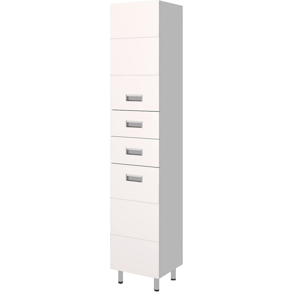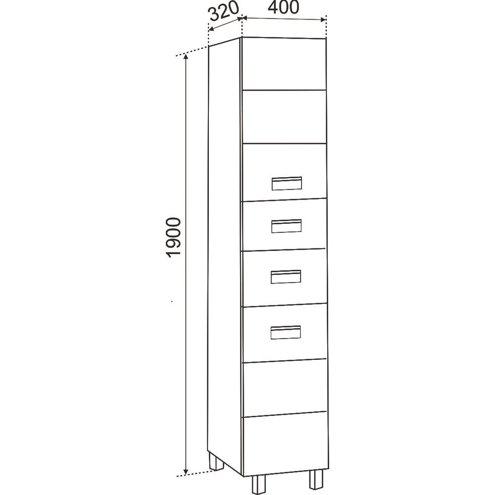 Шкаф-пенал представляет собой конструкцию размером 40x32x190 см, который можно установить как подвесной, так и напольный благодаря входящему в комплект набору опор. Корпус и фасад изготовлены из влагостойкого МДФ, покрытого пленкой, что гарантирует долговечность и легкость в уходе. Фурнитура выполнена в цвете серебра, что добавляет изысканности интерьеру. Съемные внутренние полки и возможность выдвижения ящиков позволяют удобно организовать пространство.