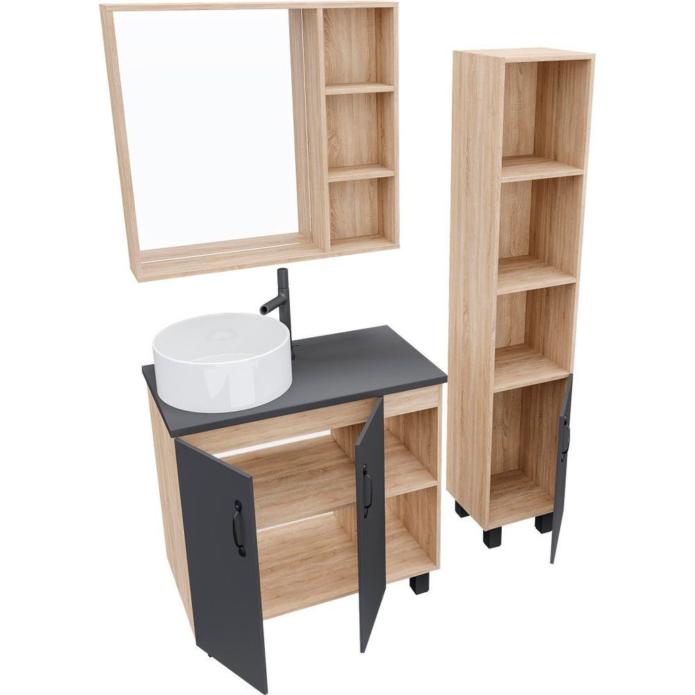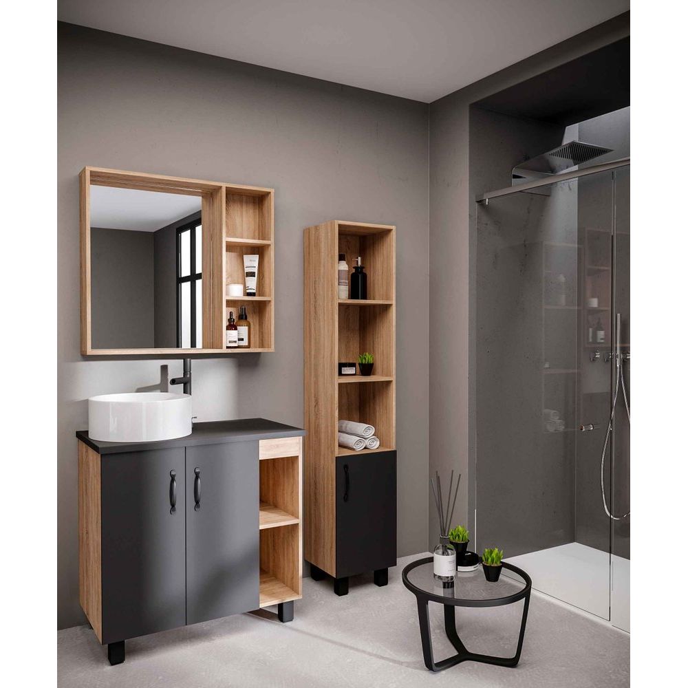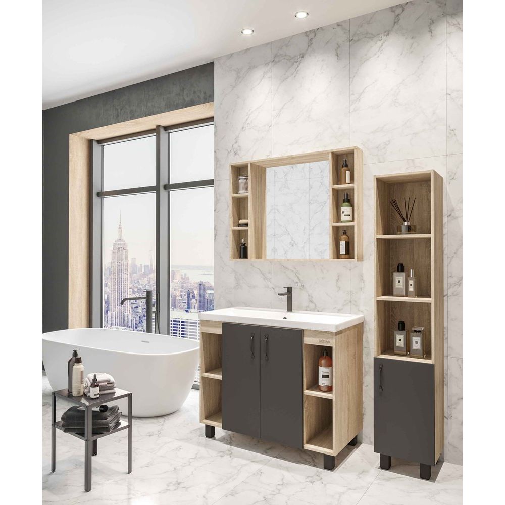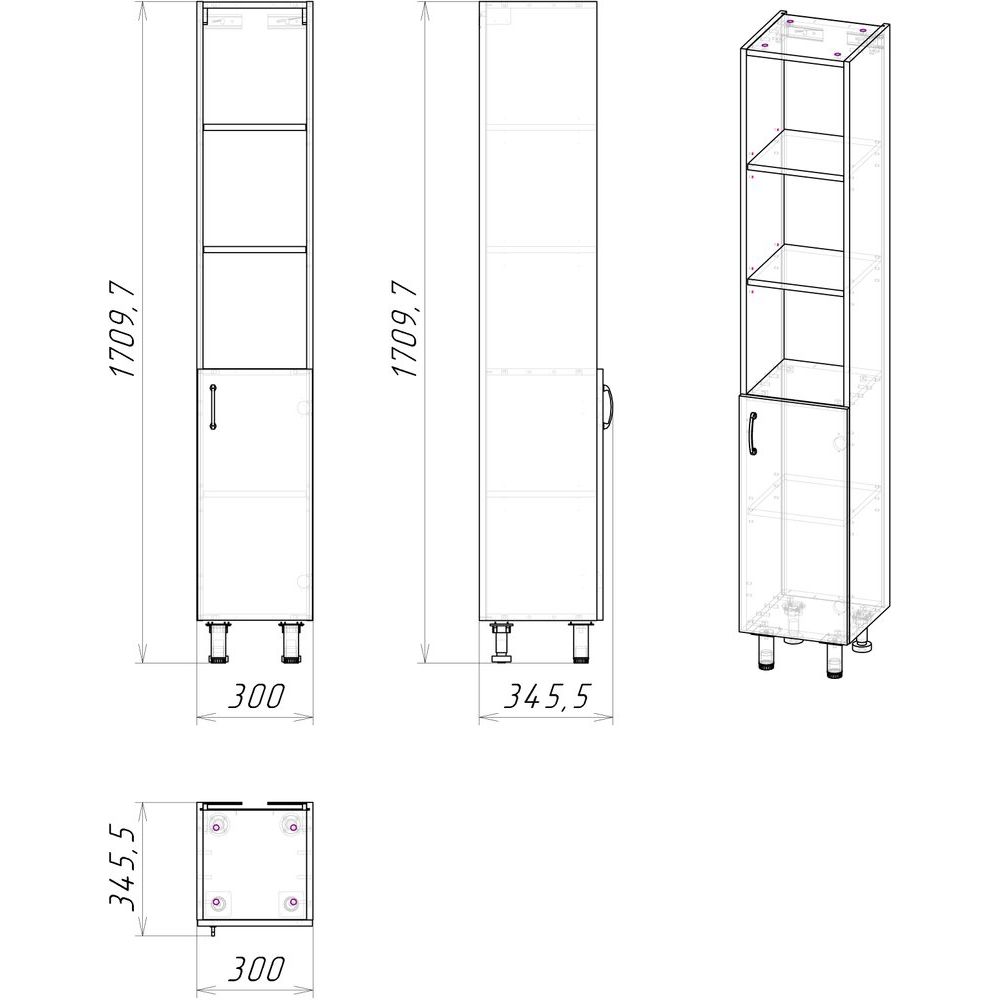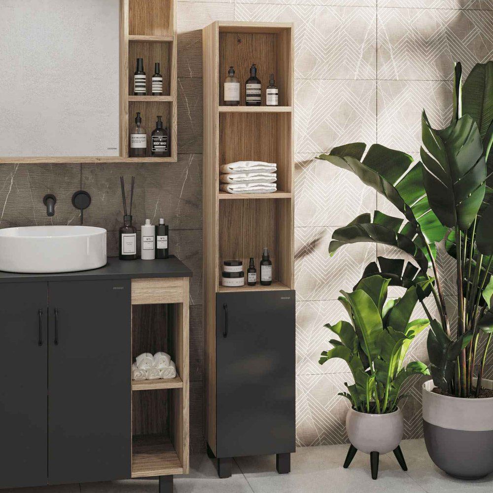 Шкаф-пенал имеет компактные габариты: ширина — 30 см, глубина — 34,55 см, высота — 171 см, что делает его идеальным для любой ванной комнаты. Корпус выполнен из ЛДСП с ламинатным покрытием, обеспечивающим долгий срок службы и устойчивость к влаге. Фасад изделия изготовлен из МДФ и покрыт пленкой, что придаёт изделию дополнительные эстетические качества. Фурнитура выполнена в матовом черном цвете, подчеркивающем современный стиль изделия. Модель напольная и оснащена дверками и открытыми полками для удобства хранения. Произведено в Германии.