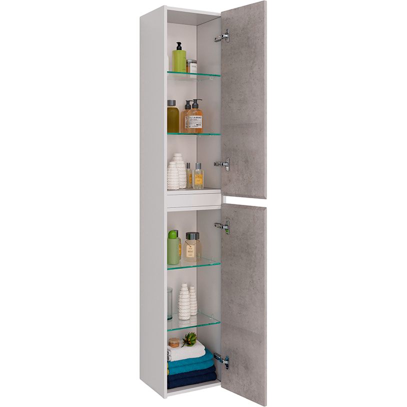 Шкаф-пенал Lemark Combi в модном бетонном цвете с белым глянцевым фасадом станет стильным и функциональным дополнением вашей ванной комнаты. Этот предмет мебели изготовлен из высококачественного ЛДСП, покрытого защитной эмалью и ламинатом, обеспечивающим долговечность и простоту ухода. Благодаря современному дизайну шкафа и возможностям его подвесного или напольного монтажа, вы можете легко интегрировать его в любое интерьерное решение.