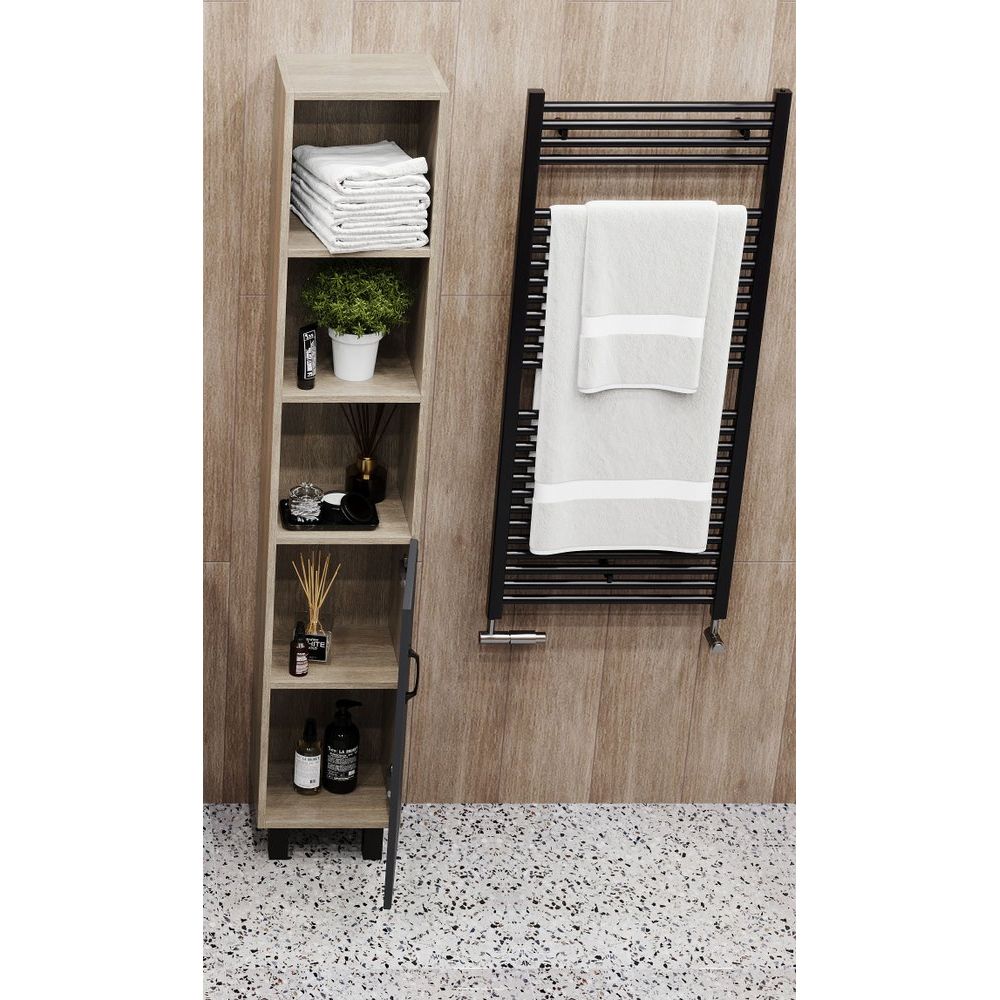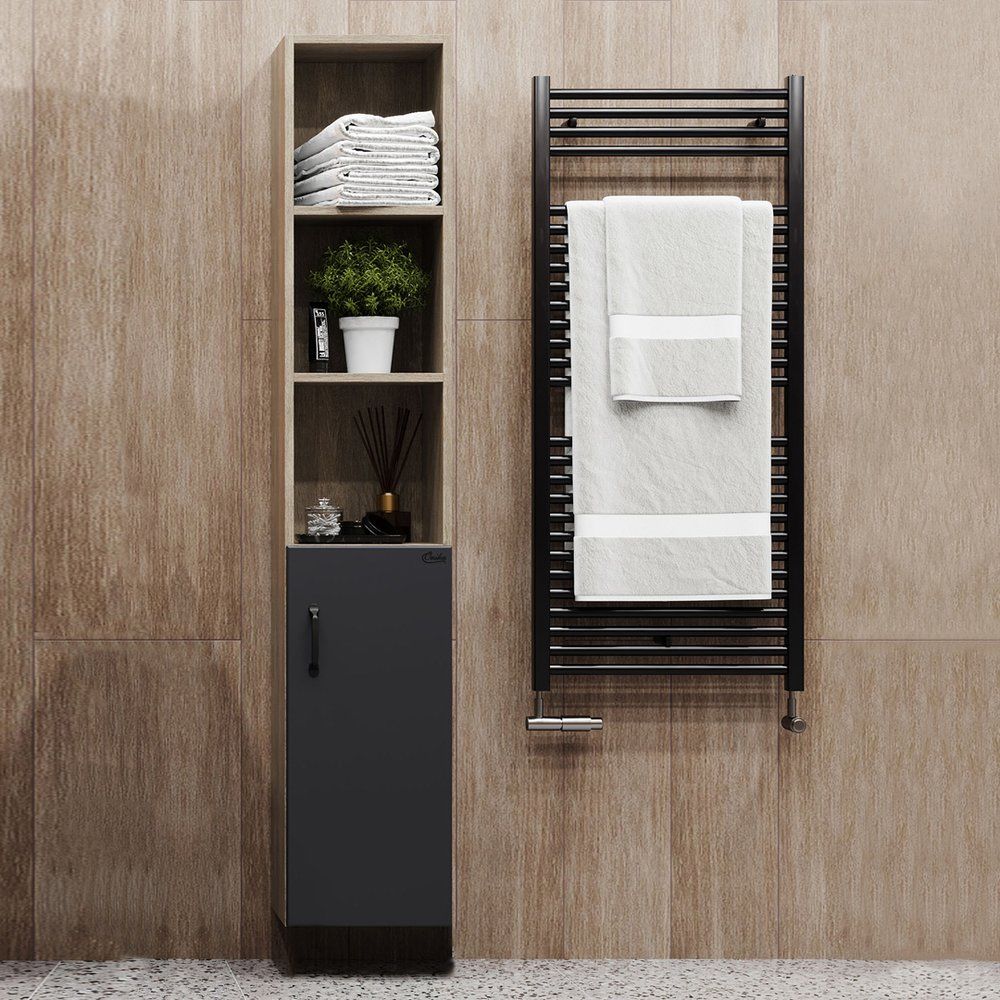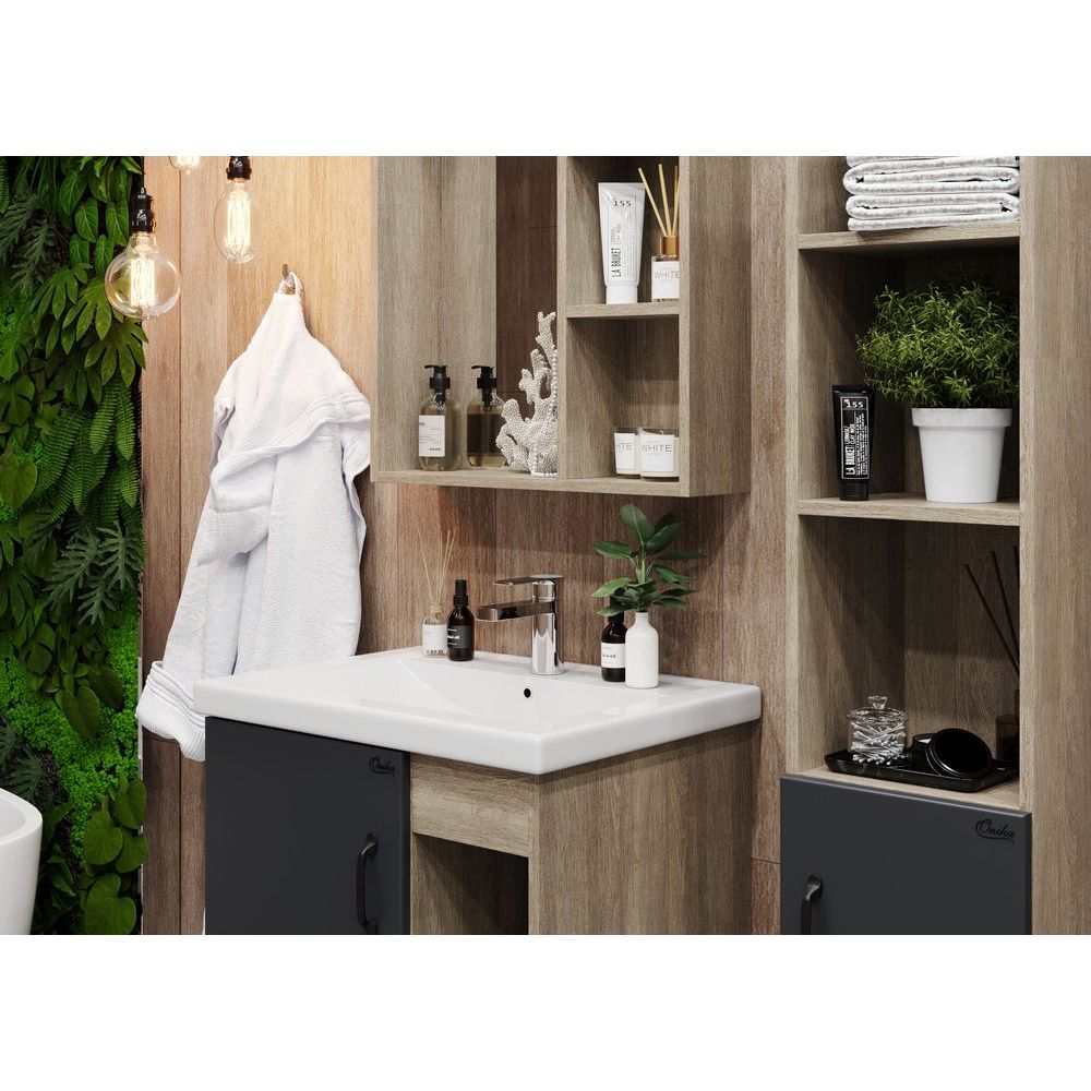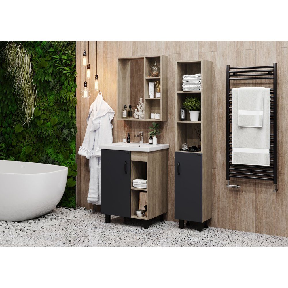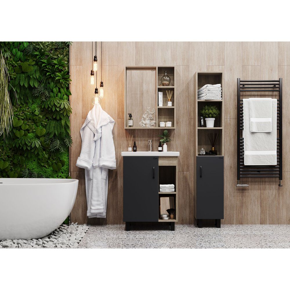 Шкаф-пенал Onika Тимбер 30.01 R в цветах серого и дуба сонома представляет собой гармоничное сочетание элегантности и функциональности. Матовый фасад с уникальным покрытием SoftTouch не только привлекателен на вид, но и приятен на ощупь. Корпус, выполненный в цвете дуба, подчеркивает натуральную текстуру древесины, создавая атмосферу уюта и тепла в вашей ванной комнате. Черная металлическая фурнитура добавляет изделию современный акцент. Открытые полки в верхней части шкафа обеспечивают легкий доступ к повседневным аксессуарам, а нижняя часть с дверцей и системой плавного закрывания идеально подходит для хранения различных бытовых предметов.