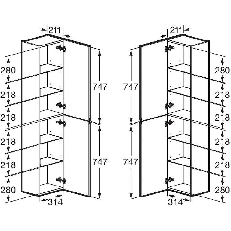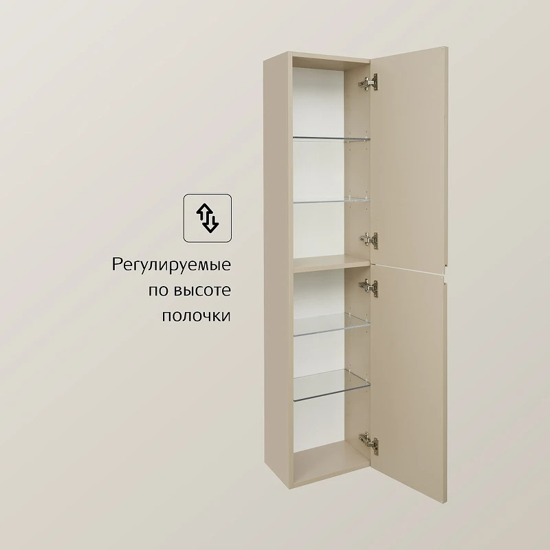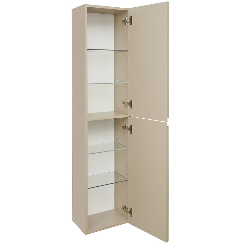 Дополняет комплект мебели OLETA шкаф-колонна в дизайне коллекции. Открытие фасадов осуществляется с помощью удобной профильной ручки. За фасадами, оснащенными петлями Hettich с плавным закрыванием, находятся регулируемые по высоте полочки из просветленного стекла.