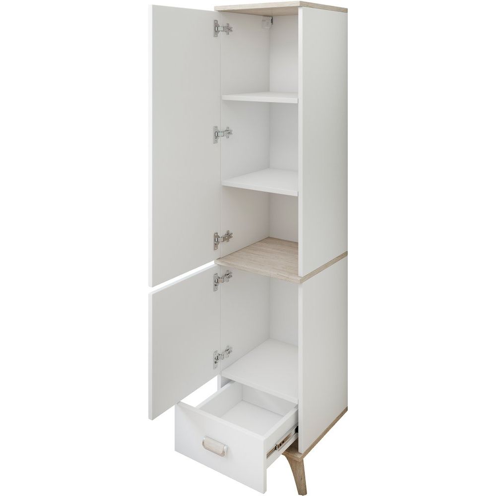 Шкаф-пенал Sanflor Бруно L имеет размеры 33,2x33,7x153 см, что делает его компактным и вместительным. Изготовлен из ДСП с эмалью, что обеспечивает долговечность и устойчивость к влажности. Фасад снабжен удобной хромированной и деревянной фурнитурой. Внутри шкаф оснащен съемными полками и выдвижными ящиками, позволяющими разместить все необходимые вещи. Подвесная конструкция дополнена дополнительной опорой для повышенной надежности.