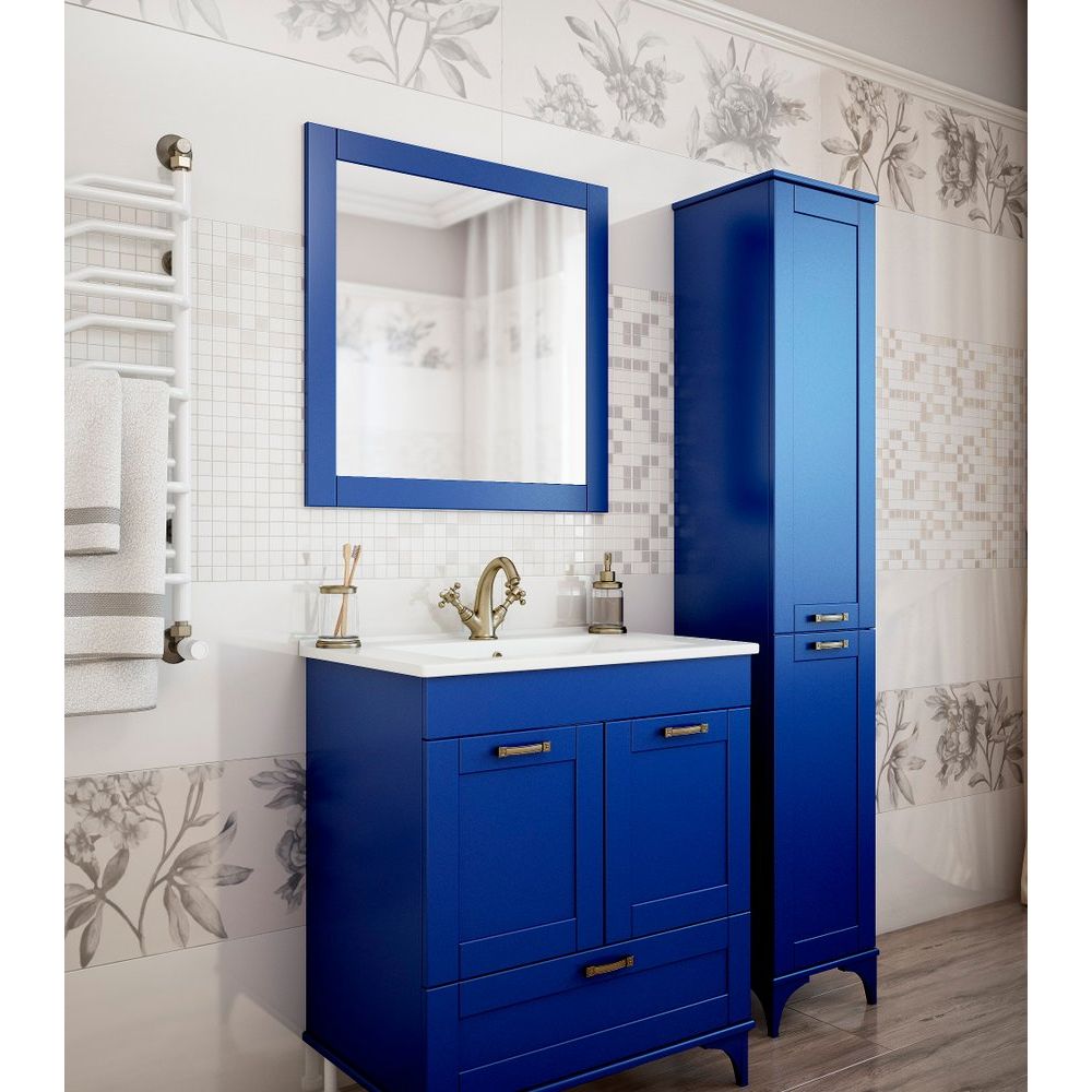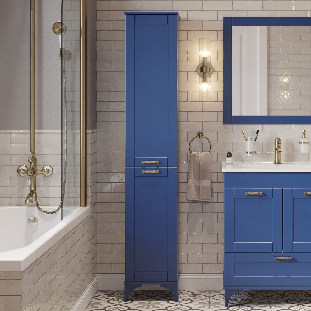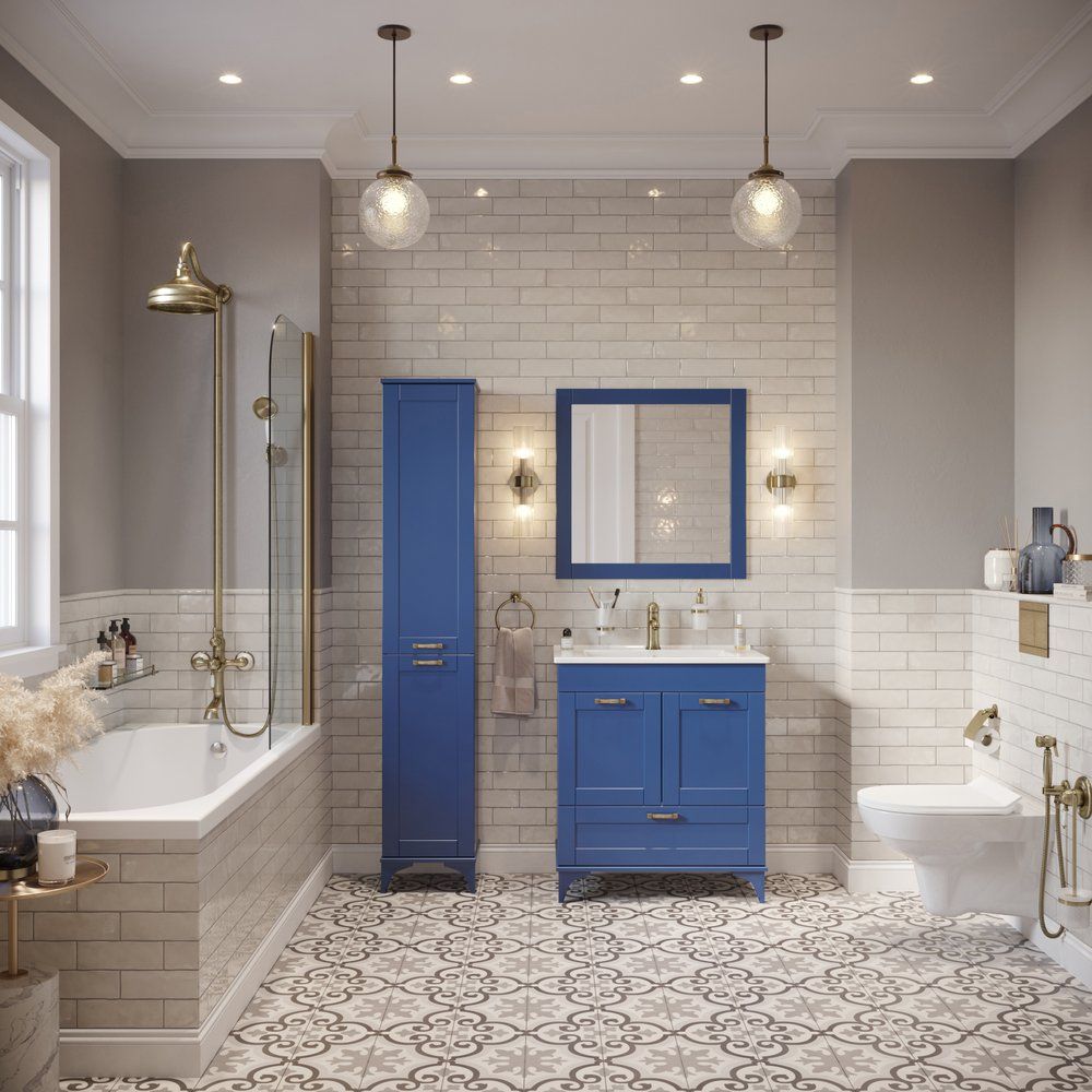 - Уникальный дизайн: глубокий цвет индиго и бронзовая фурнитура создают стильный акцент в ванной.