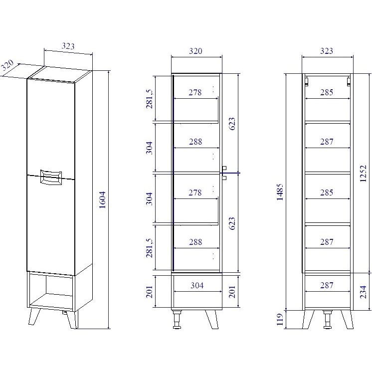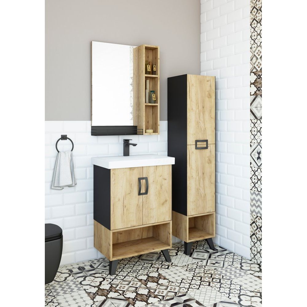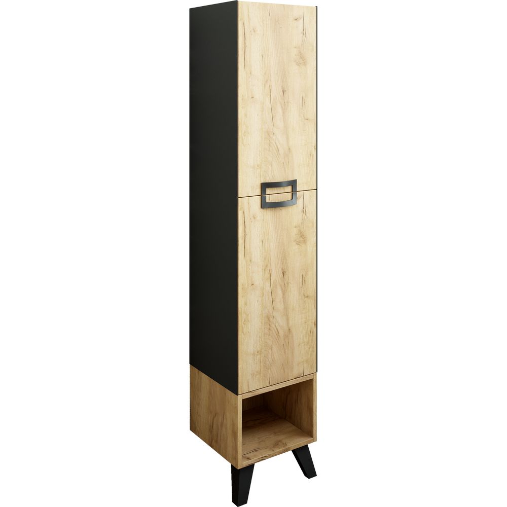Шкаф-пенал Sanflor Выборг дуб крафт золотой имеет габариты 32,3x32x160,4 см, что делает его компактным, но вместительным. Этот подвесной шкаф оснащен ножками для стойкости и дополнительной опорой, что обеспечивает его надежность. В его конструкции использованы ЛДСП с ламинатным покрытием как для корпуса, так и для фасада, что гарантирует долговечность и устойчивость к влаге. Черная фурнитура придаёт элегантность и современный акцент, а дверки и открытые полки обеспечивают удобный доступ к хранимым вещам.