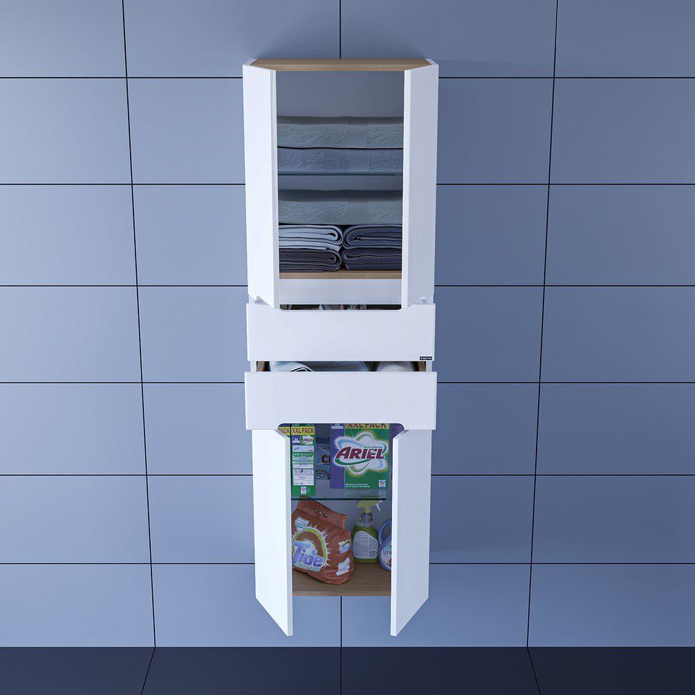 Этот шкаф-пенал имеет размеры 50x30x150 см, что делает его достаточно вместительным и в то же время компактным. Корпус изготовлен из прочного ЛДСП, покрытого ламинатом для дополнительной защиты от влаги, в то время как фасад отличается изысканностью благодаря использованию МДФ и декоративной пленки. Внутренние полки являются несъемными, что придает конструкции дополнительную устойчивость. Надежная хромированная фурнитура гарантирует долгий срок службы изделия. Продуманная система с доводчиком обеспечивает плавное закрытие дверок, сводя к минимуму износ.