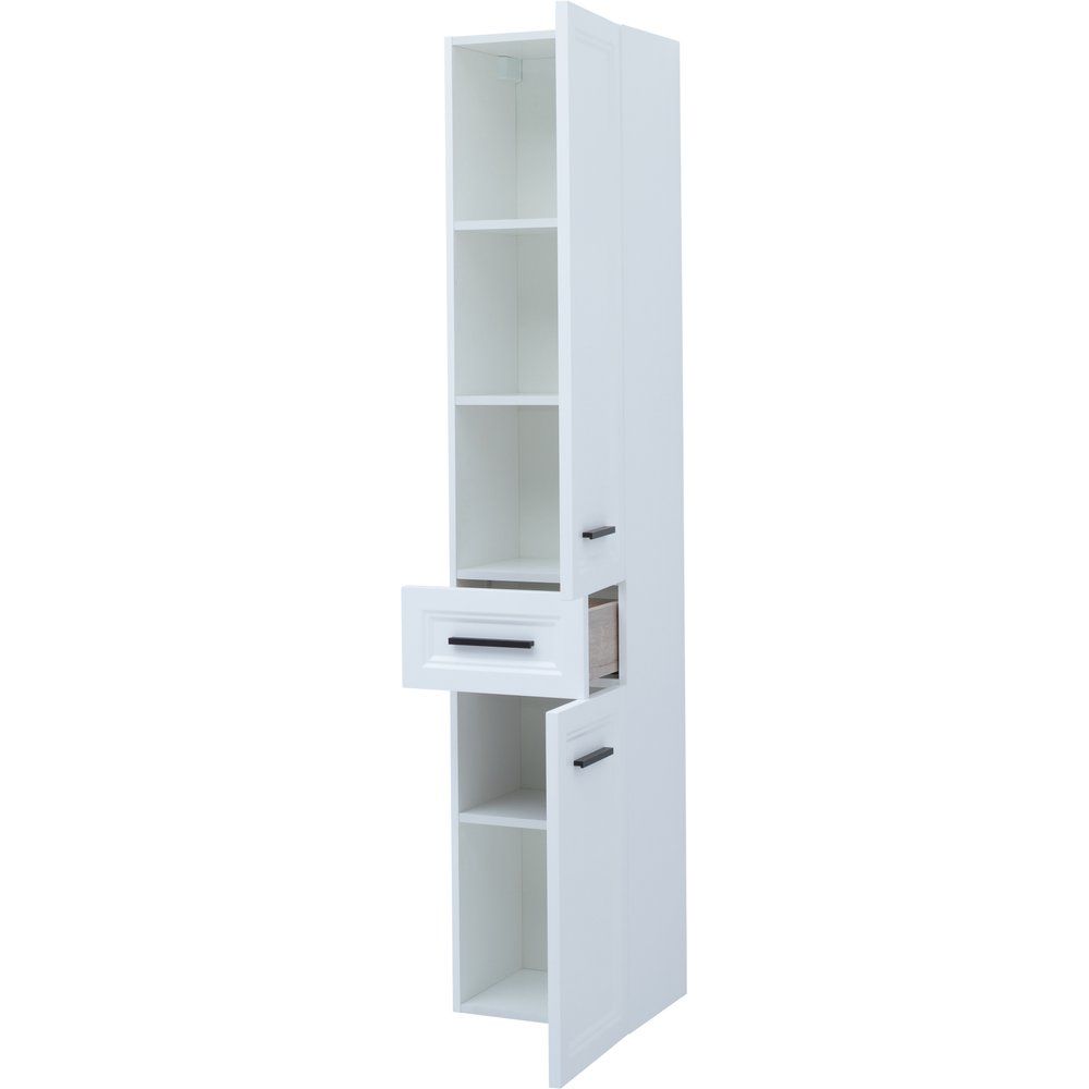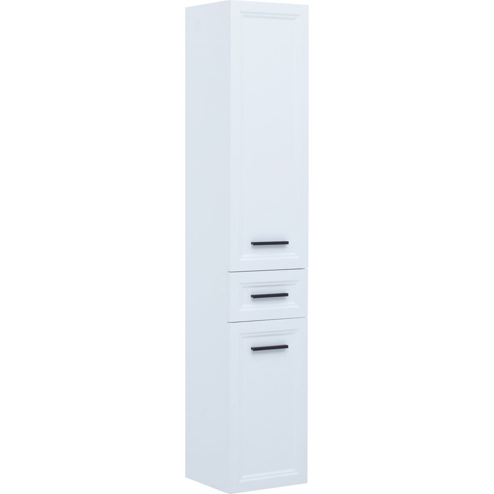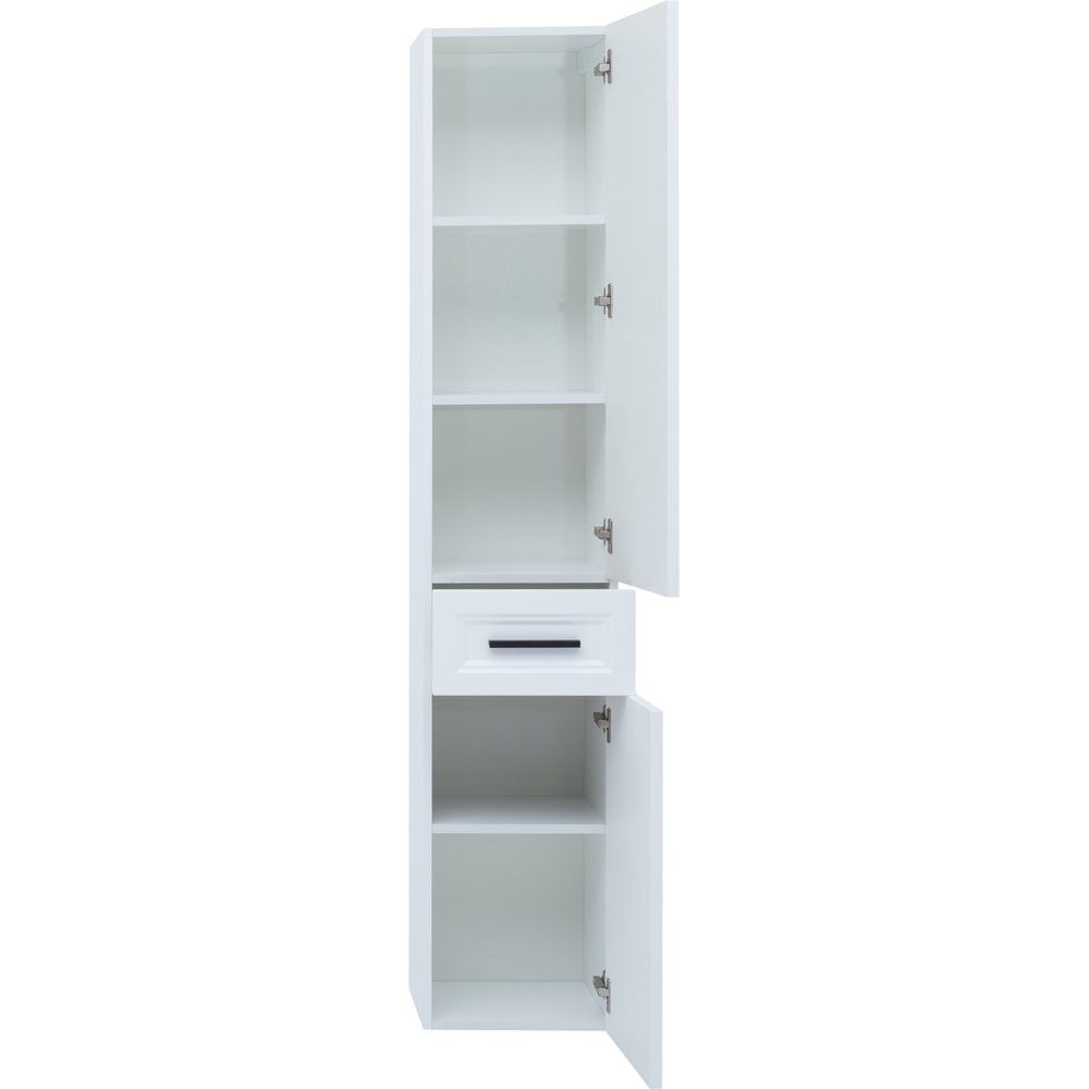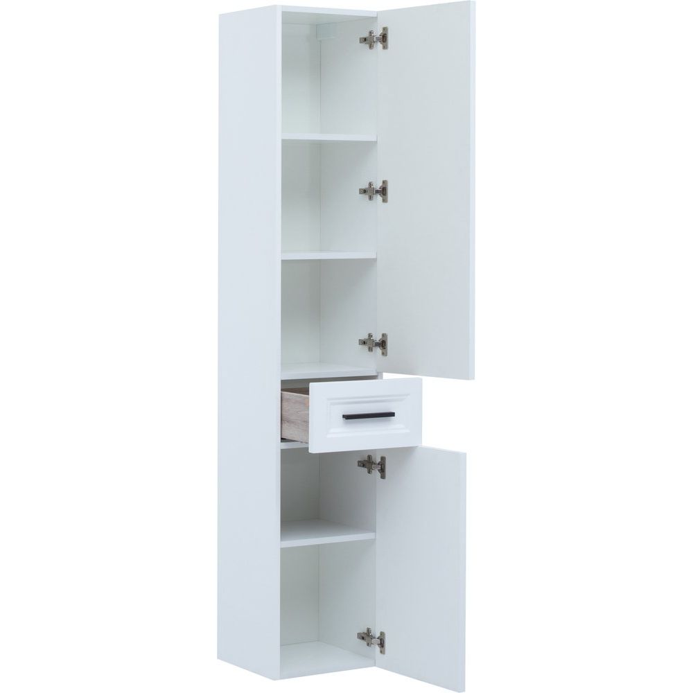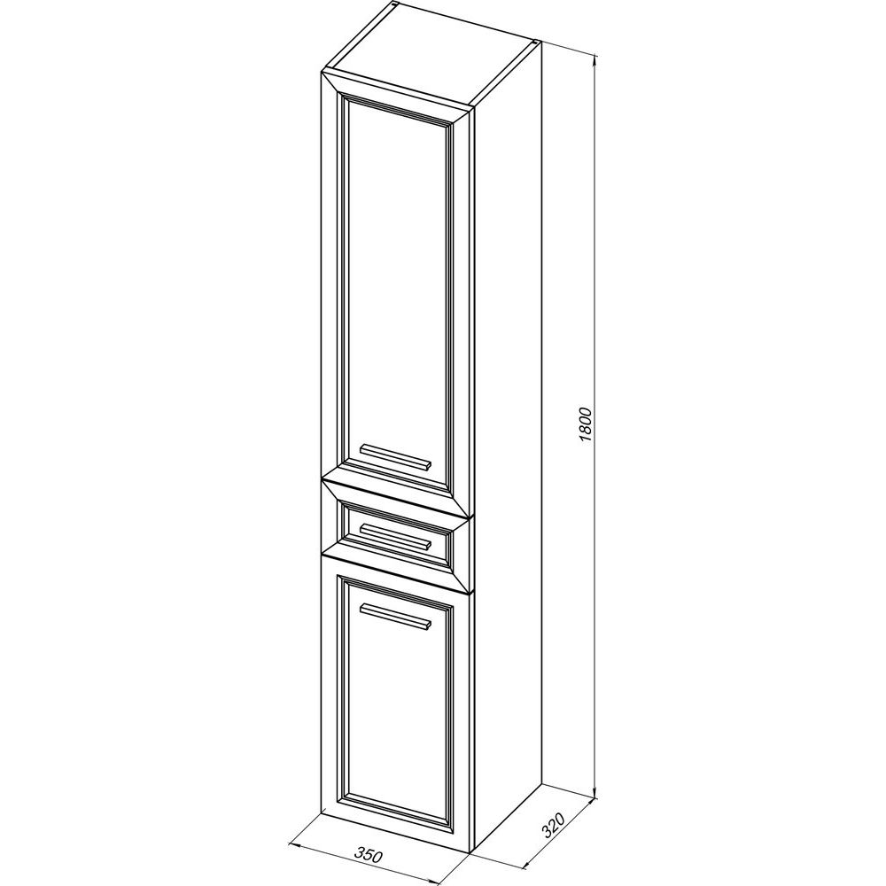 Шкаф-пенал имеет размеры 35x32x180 см и предназначен для подвесного монтажа, что позволяет экономить пространство и обеспечивать удобство доступа. Корпус выполнен из ДСП, покрытого эмалью и ламинатом, а фасад — из МДФ, также покрытого эмалью. Чёрная фурнитура подчеркивает стильный и сдержанный внешний вид. Внутренние полки несъемные, что добавляет стабильности всей конструкции.