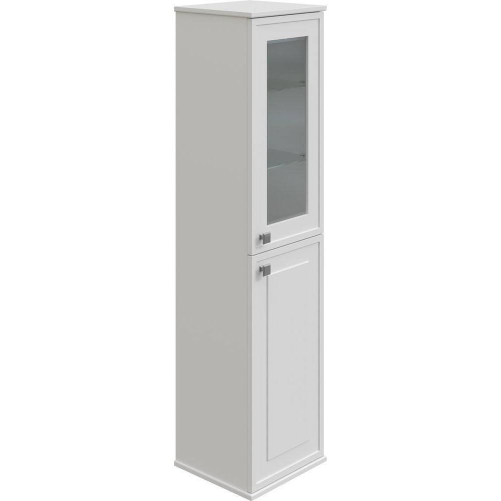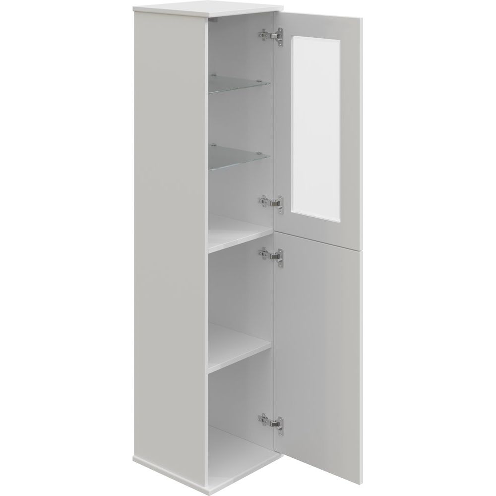 Шкаф-пенал имеет размеры 34,2x32,5x141 см, что делает его идеальным для экономии пространства. Подвесная конструкция упрощает уборку, оставляя пол под шкафом свободным. Корпус выполнен из ламинированного ЛДСП, обеспечен эмалевым и ламинатным покрытием для большей стойкости. Фасад из МДФ и стекла также покрыт эмалью и ламинатом, что придаёт изделию элегантный вид. В комплекте предусмотрена качественная серой фурнитура, дополняющая дизайн. Гарантия на изделие составляет 2 года.