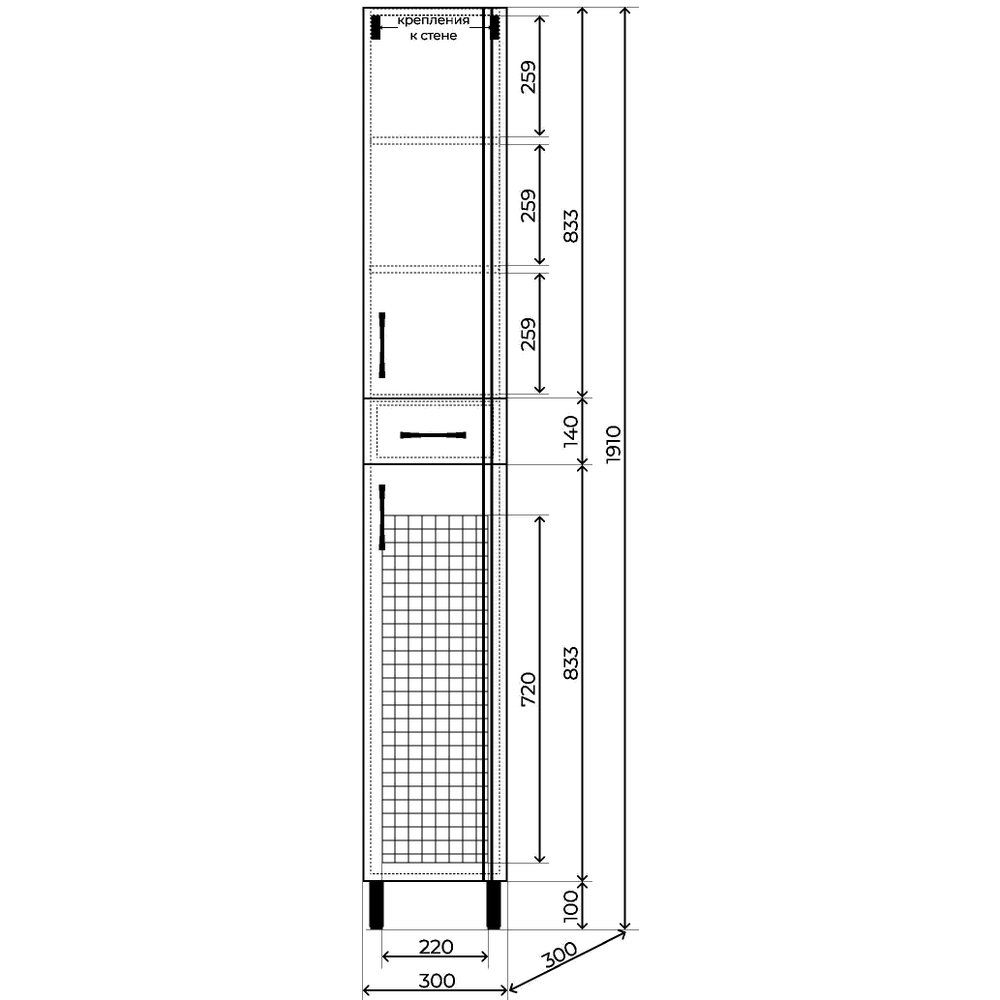 Шкаф-пенал обладает следующими размерами: ширина 30 см, глубина 30 см и высота 191 см. Изделие подвесное, дополнительно оснащено ножками для устойчивости. Корпус выполнен из ДСП с ламинатным покрытием, а фасад — из МДФ с пленочным покрытием. Неподвижные полки создают надежное внутреннее пространство, обеспечивая хранение без компромиссов.