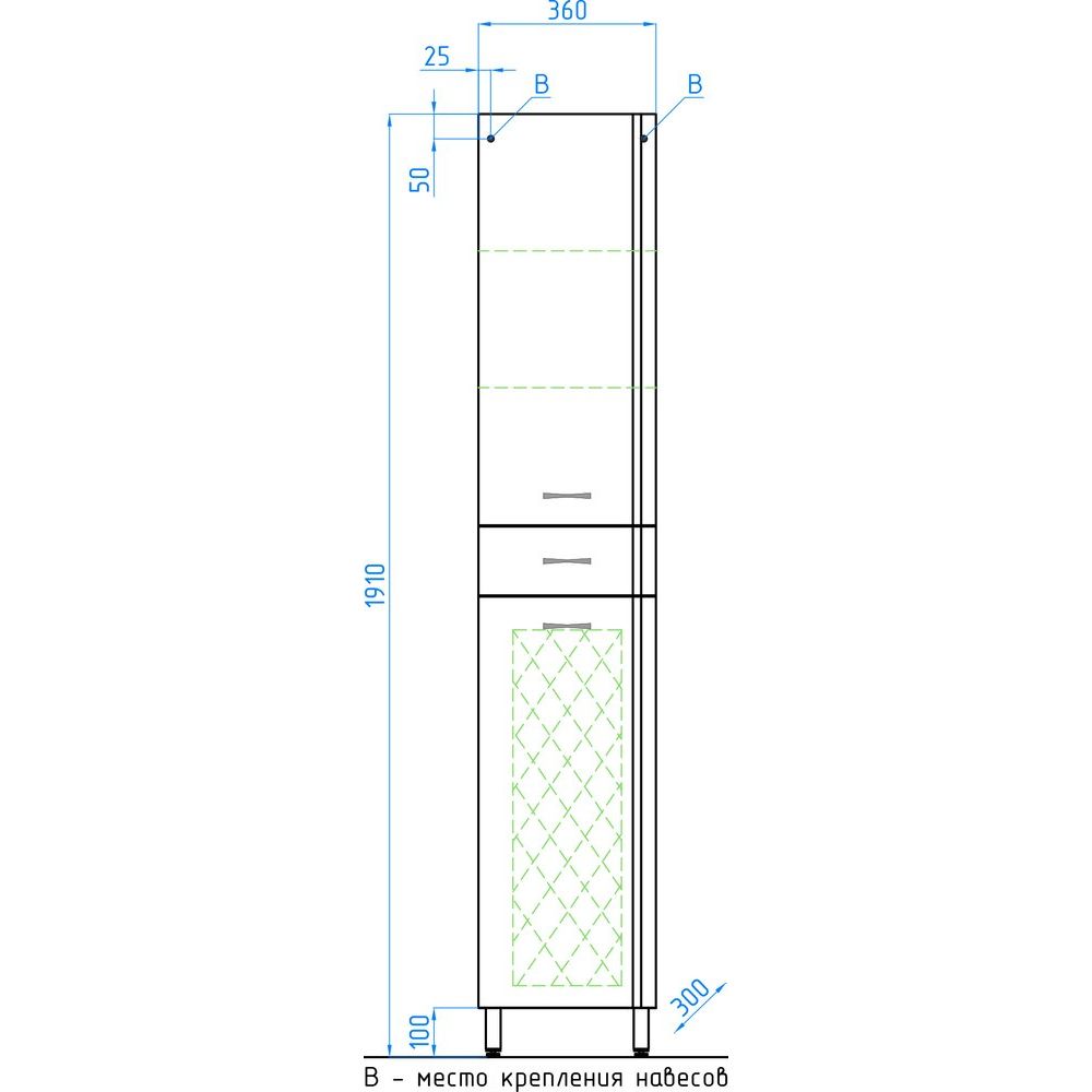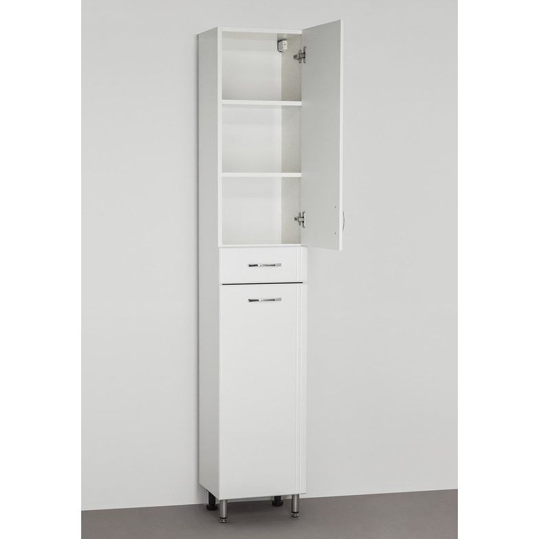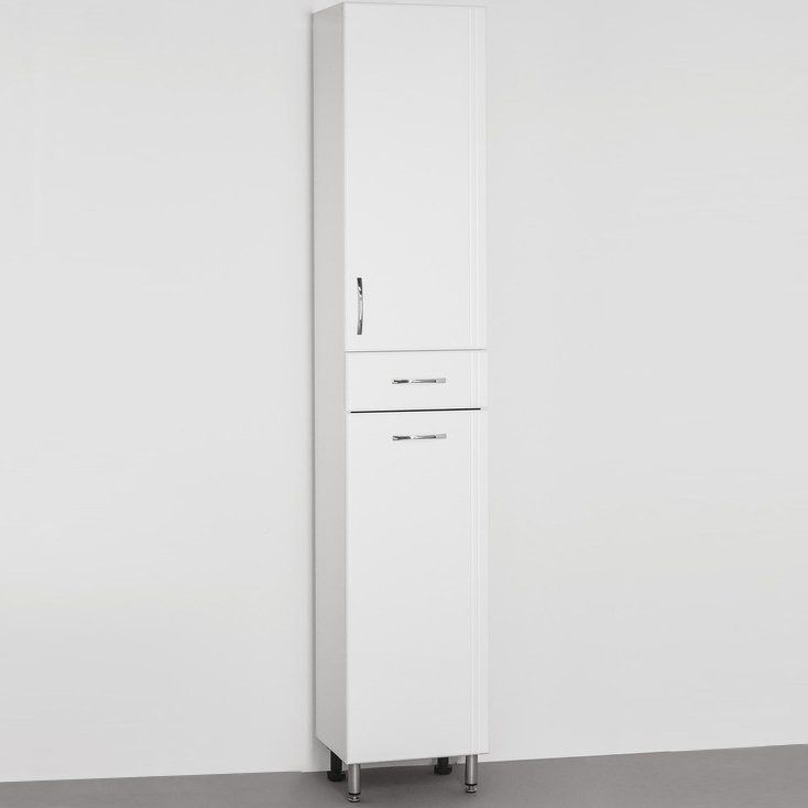 Шкаф-пенал выполнен из прочной ЛДСП с ламинатным покрытием, а фасад оформлен пленкой, создающей глянцевый эффект. В комплекте бесперебойная хромированная фурнитура. Он может быть установлен как на пол, так и повешен на стену благодаря кронштейнам и дополнительной опоре для надежности. Корпус шкафа тщательно продуман: двери, выдвижные ящики и встроенная корзина для белья обеспечивают максимальную функциональность.