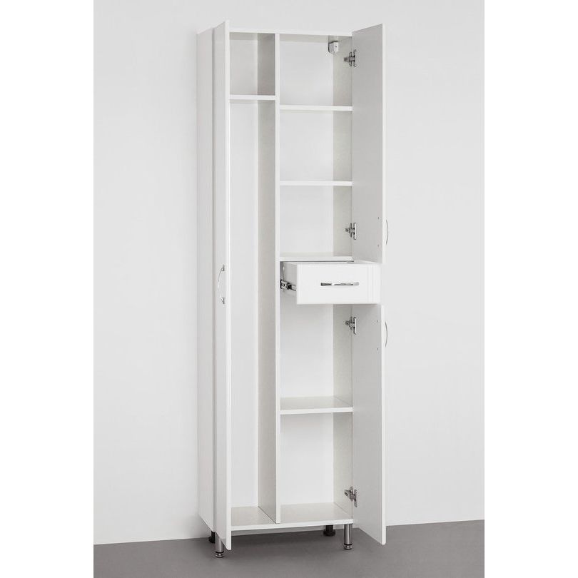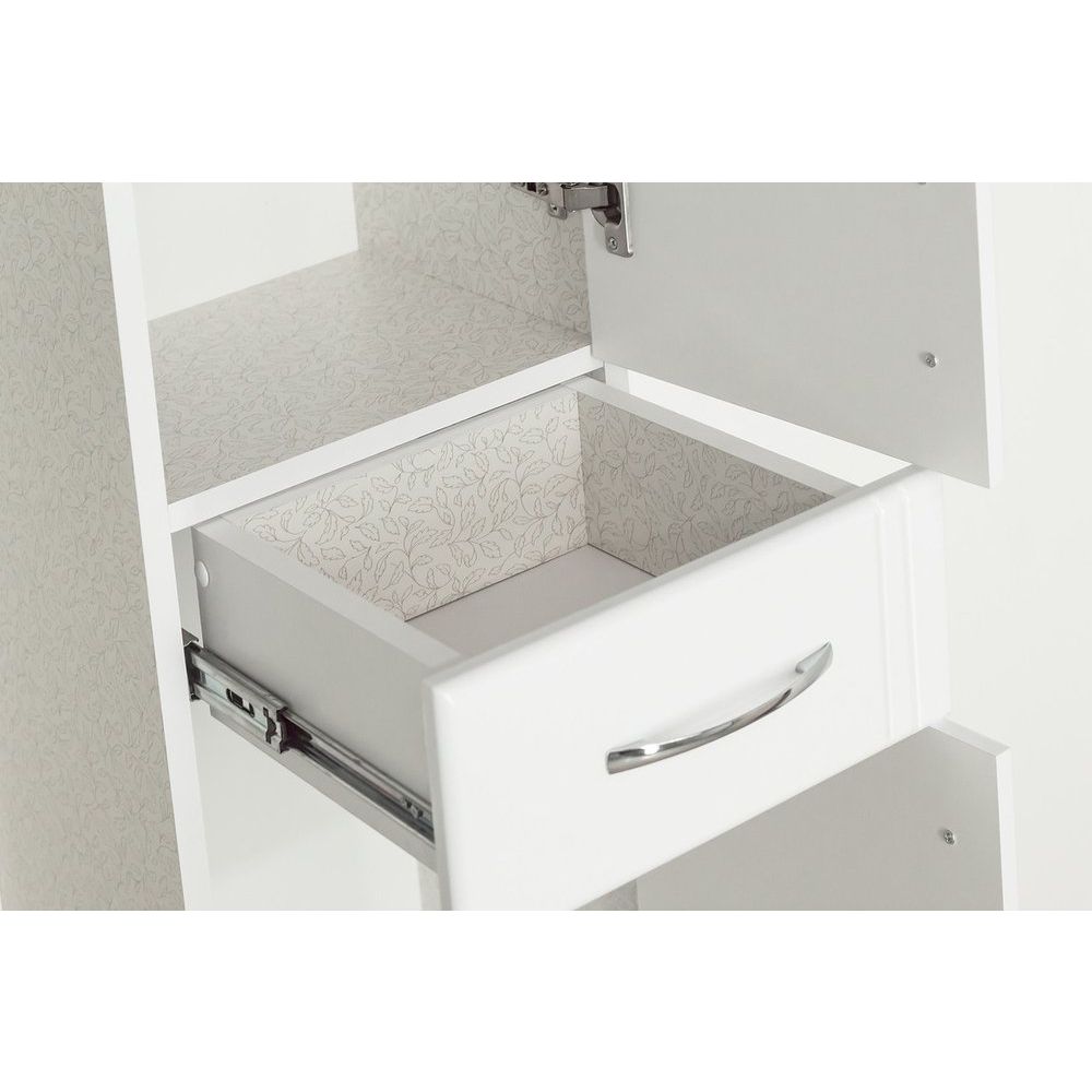 Шкаф-пенал Style Line Эко Стандарт 54 имеет габариты 54x30x191 см и может быть установлен как в подвесном, так и в напольном варианте благодаря специальным скрытым кронштейнам и ножкам для дополнительной опоры. Корпус выполнен из ЛДСП с ламинатным покрытием, а фасад из ДСП с пленкой, обеспечивающей долговечность и защиту от воздействия влаги. Каждый элемент фурнитуры изготовлен из хрома, что добавляет изделию эстетическую привлекательность и надежность. Внутренние полки не снимаются, что гарантирует устойчивость конструкции, а ящик полного выдвижения оснащен направляющими Hettich.