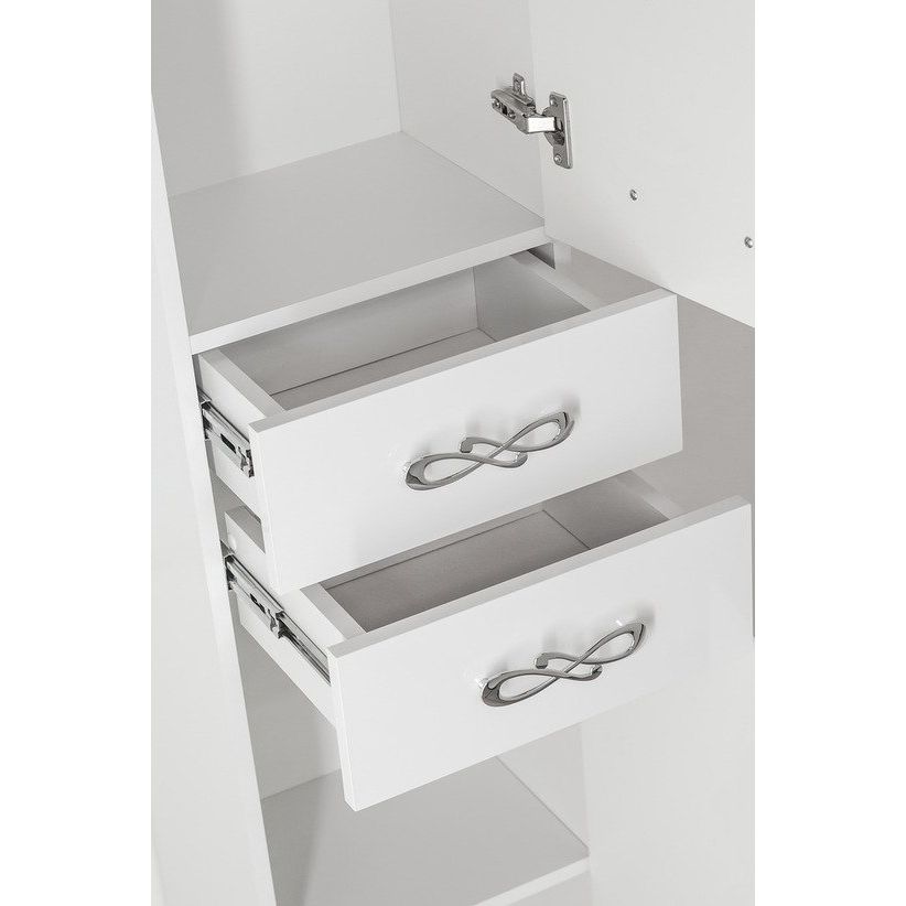 Шкаф-пенал имеет размеры 36x30x191 см и подходит для подвесной установки, однако для большей стабильности предусмотрены дополнительные опоры. Корпус из ламинированного ДСП и фасад из МДФ с пленочным покрытием обеспечивают отличную стойкость к влажности и износу, а хромированная фурнитура придает изделию изысканность. Конструкция включает в себя несъемные внутренние полки и механизм плавного закрывания.