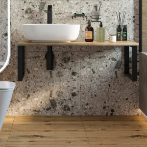 Перед установкой важно учесть, что эта столешница поставляется с отверстием под раковину, что облегчает процесс монтажа, но требует внимательности при выборе и установке дополнительных крепёлений. Убедитесь, что у вас есть все необходимые комплектующие, такие как крепёжные элементы и донный клапан, для завершения установки. Раковина подходит для сифонов диаметром 3.2 см, а держатели обеспечат надёжный подвесной монтаж столешницы.