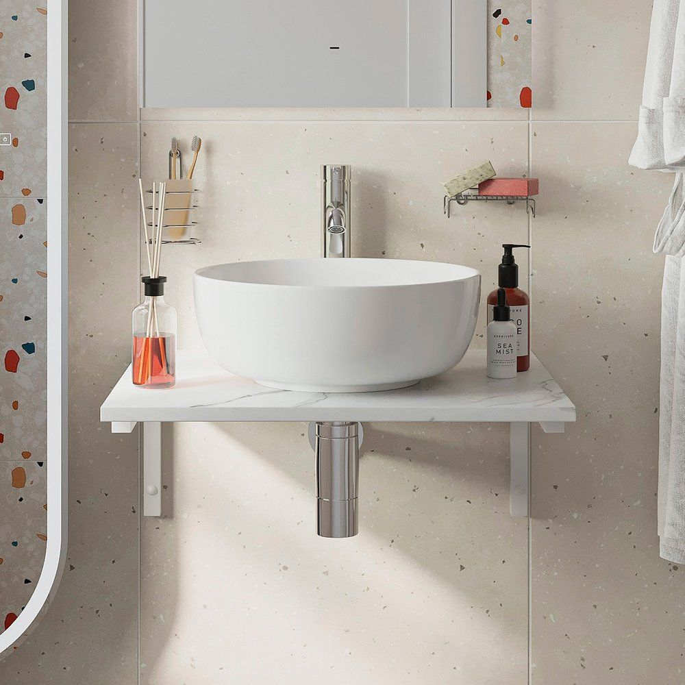 При выборе данной модели имейте в виду: столешница уже имеет готовое отверстие для установки раковины, однако для монтажа потребуется приобретение донного клапана. Это решение не только подчеркнет индивидуальный стиль вашей ванной, но и обеспечит удобство в использовании благодаря продуманной конструкции раковины и надёжности настенных держателей.