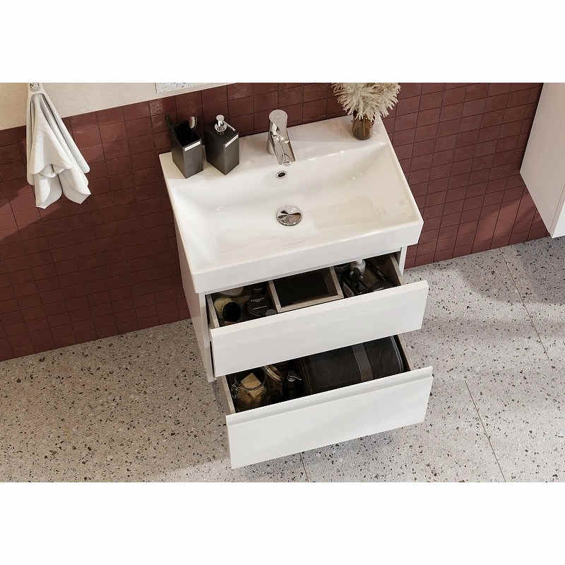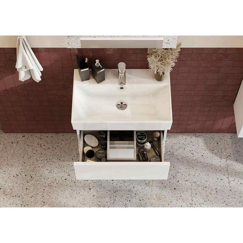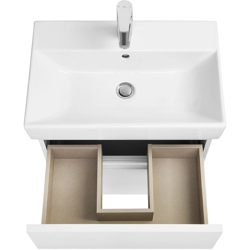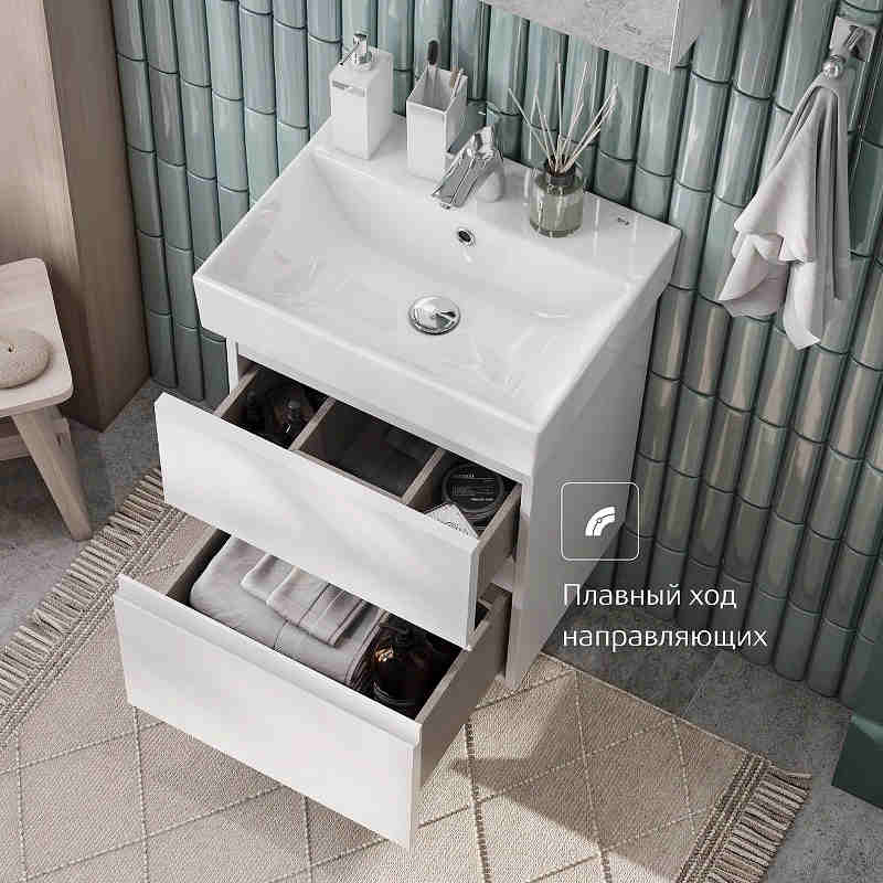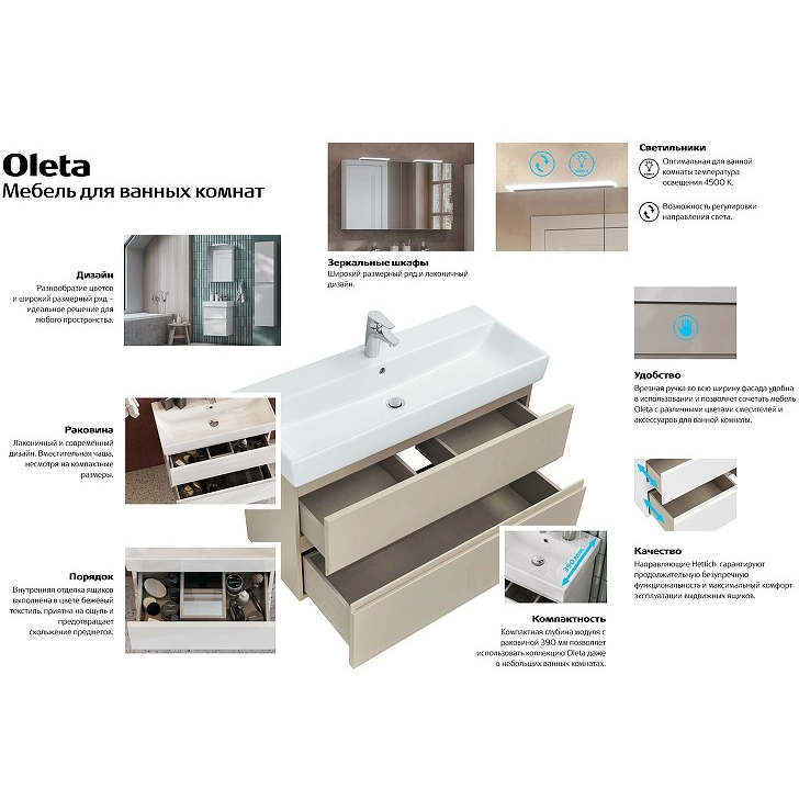 Тумба под раковину позволяет использовать мебель Oleta даже в небольших ванных комнатах. Несмотря на компактную глубину, тумба комплектуется раковиной Oleta с достаточно вместительной чашей. Лаконичный и современный дизайн раковины притягивает к себе взгляд. 2 выдвижных ящика тумбы установлены на направляющие HETTICH, которые гарантируют продолжительную безупречную функциональность и максимальный комфорт эксплуатации. Скрытый монтаж не портит элегантный дизайн мебели, а возможность полного выдвижения обеспечит быстрый доступ к необходимым предметам. Внутренняя отделка ящиков выполнена в цвете бежевый текстиль, приятна на ощупь и предотвращает скольжение предметов. Профильная ручка во всю ширину фасада удобна в использовании и позволяет сочетать мебель Oleta c различными цветами смесителей и аксессуаров для ванной комнаты. Ручка выполнена в виде J-профиля.