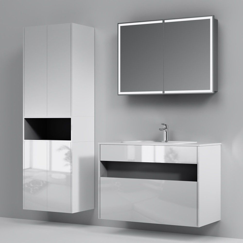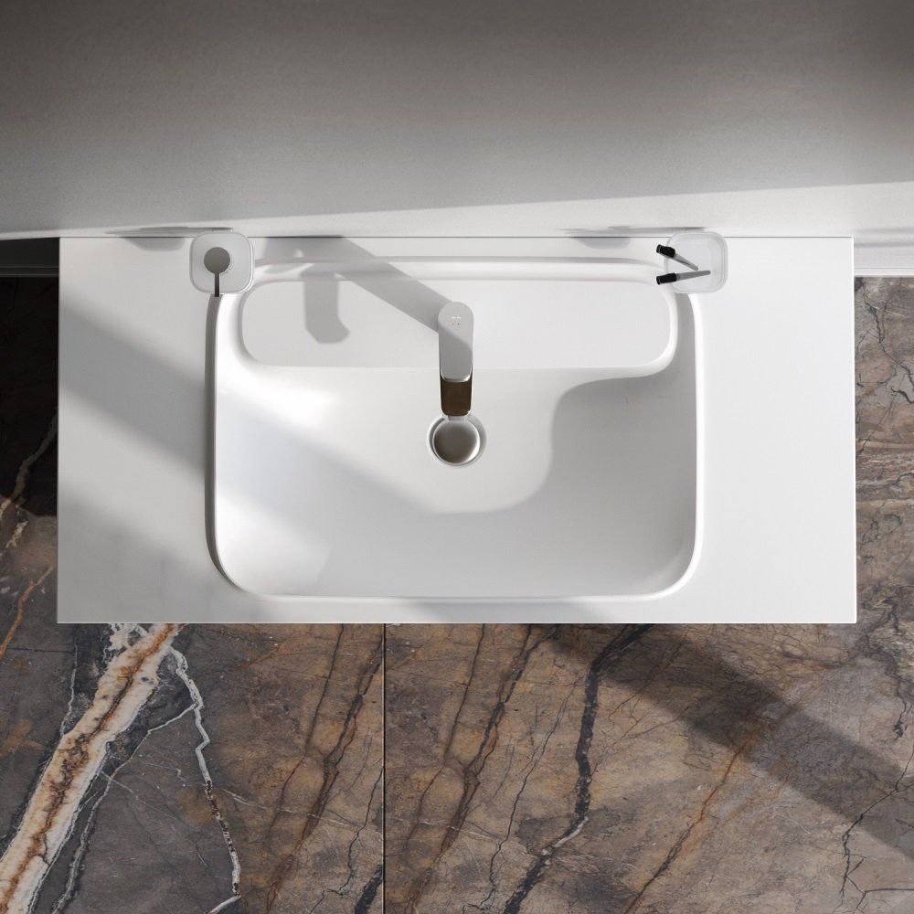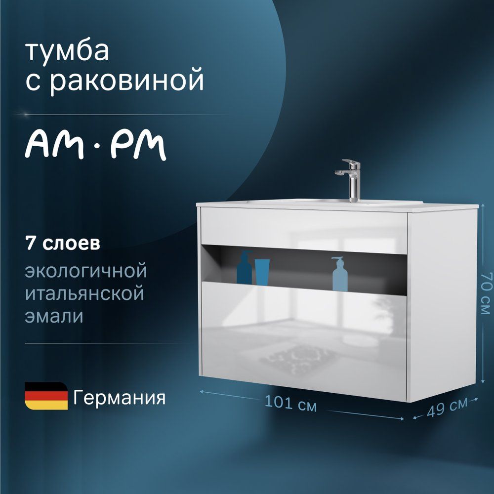 Мебельный комплект включает тумбу и раковину AM.PM Func 100 с общими габаритами 100x49x70 см. Тумба изготовлена из ЛДСП с эмалированным и ламинированным покрытием, предлагается как для напольной, так и для подвесной установки. Оснащена механизмом доводчика для плавного закрывания. Раковина изготовлена из прочного искусственного мрамора с размерами 100,8x49,2 см, оснащена слив-переливом, имеет одно отверстие под смеситель и требует отдельно приобретаемого донного клапана. На все изделия предоставляется гарантия 3 года, что подтверждает их высокое качество и надежность производства в Германии.