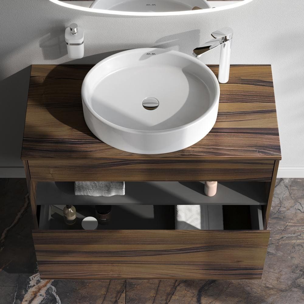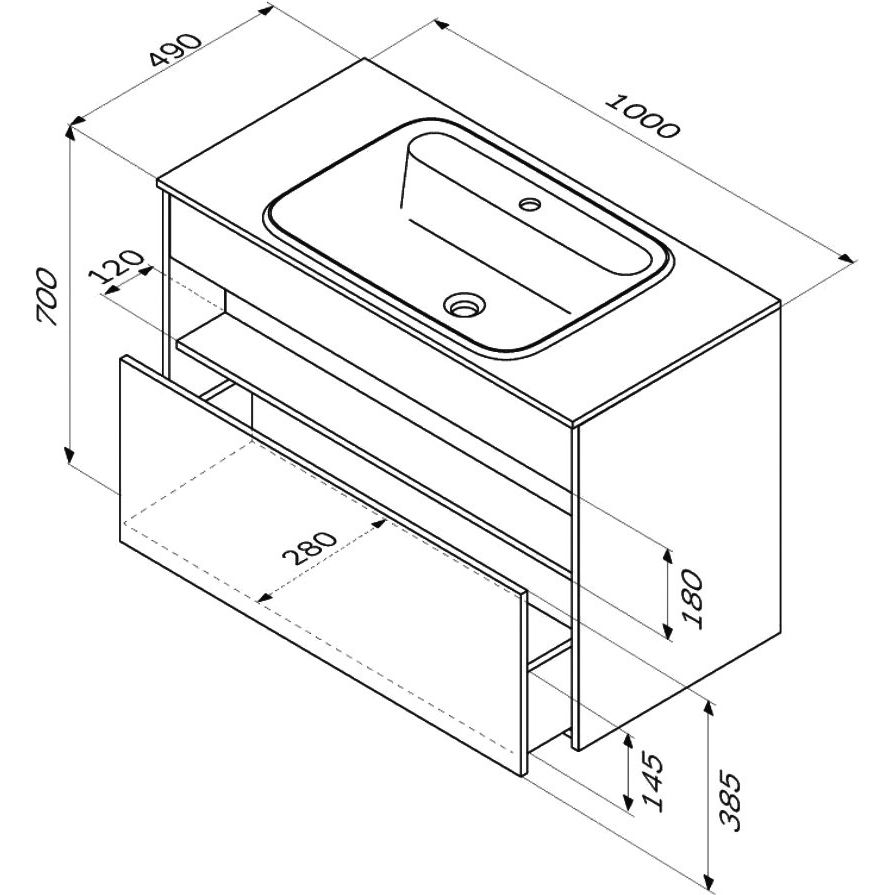 Тумба для комплекта AM.PM Func 100 выполнена в популярном цвете дуб крафт и имеет размеры 100x49x70 см. Она поддерживает как напольный, так и подвесной монтаж. Механизм доводчика обеспечивает плавное закрытие, а корпус и фасад из ЛДСП с ламинатным покрытием устойчивы к влаге. В комплекте идет мебельная раковина из фарфора размера 55x45 см, рассчитанная на сифон диаметром 3.2 см. Комплект поставляется с 25-летней гарантией на раковину, что свидетельствует о высоком качестве материалов и сборки. Столешница из ЛДСП с ламинатным покрытием в цвете светлого дерева размером 100.4x50x1.6 см не имеет готовых и намеченных отверстий под смеситель, что даёт возможность индивидуальной настройки.