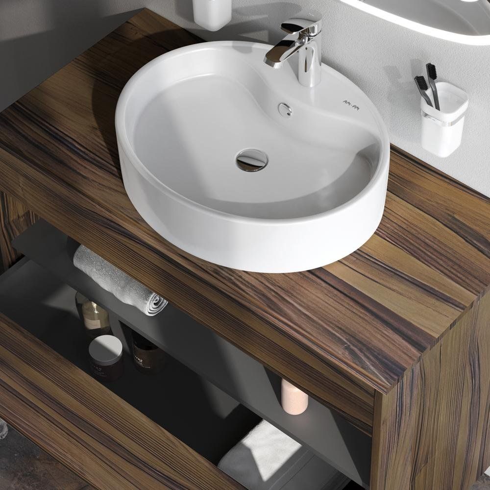 Тумба с раковиной AM.PM Func 100 имеет габариты 100x49x70 см и подходит для как напольного, так и подвесного монтажа. Выполнена из ЛДСП с ламинированной поверхностью в цвете дуб крафт, она устойчива к воздействию влаги. Раковина из фарфора имеет размер 56x45 см и оснащена встроенным слив-переливом. Столешница идет без готовых отверстий для смесителя, что дает возможность индивидуальной установки. Все изделия произведены в Германии и имеют длительную гарантию.