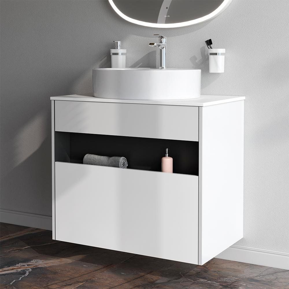 Столешница выполнена из ЛДСП с покрытием в виде ламината и эмали, измеряется 80.4x50x1.6 см, и поставляется без отверстий для смесителя.