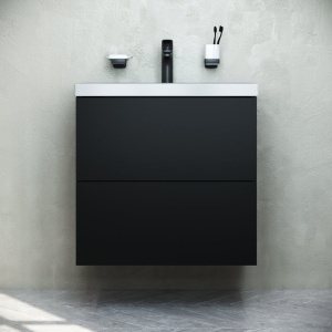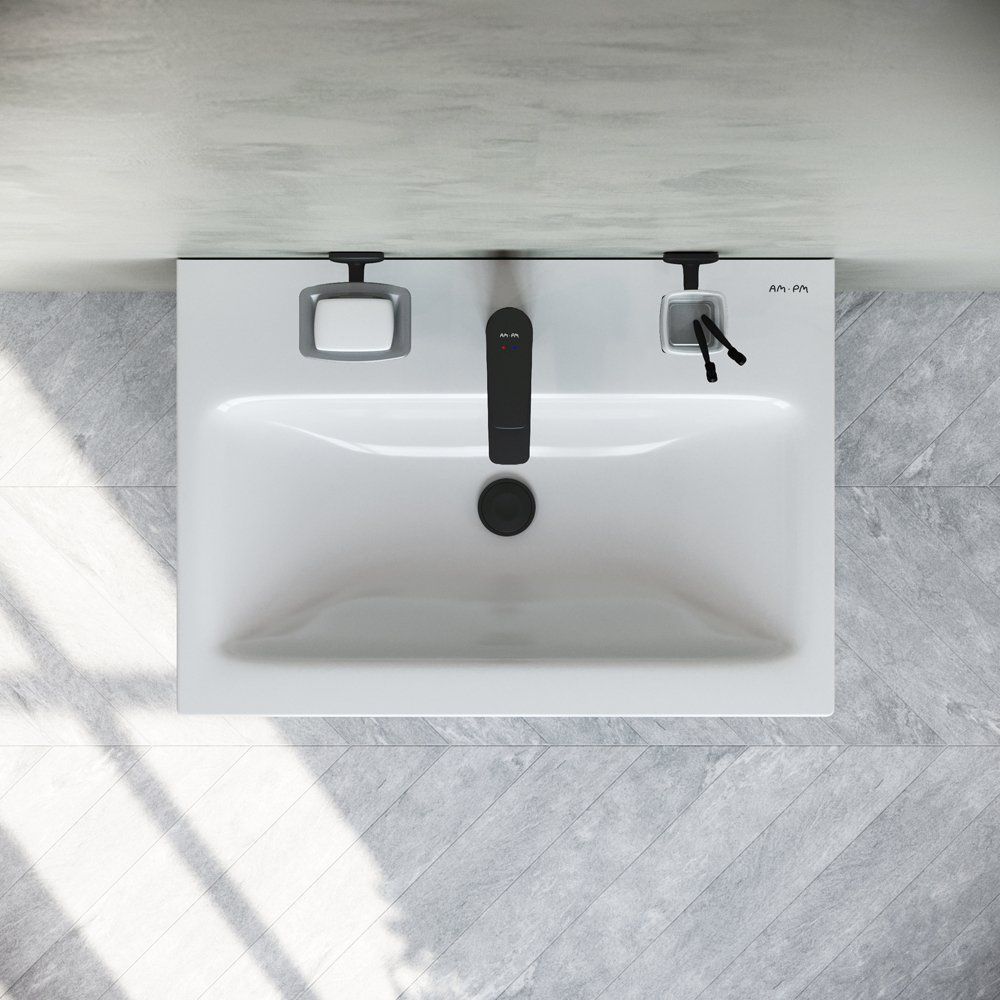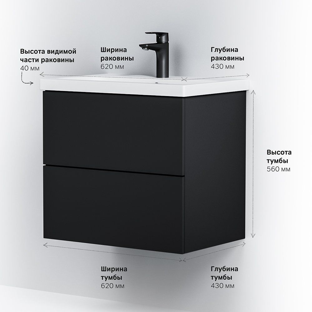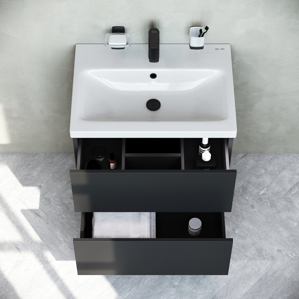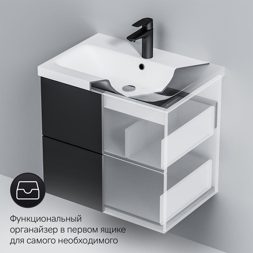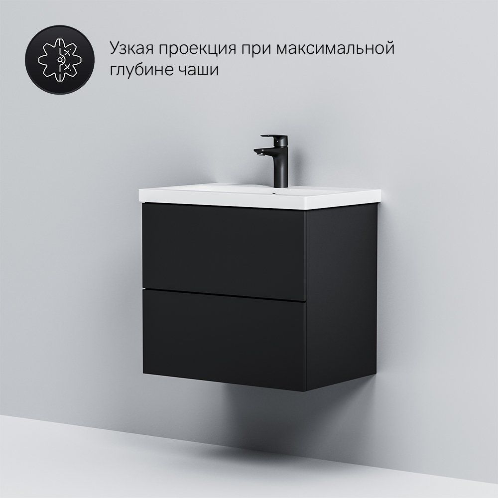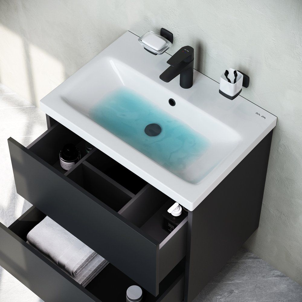 Черный матовый подвесной комплект «Тумба с раковиной AM.PM Gem 60» – это стильное и функциональное решение для вашей ванной комнаты. Изящное сочетание современной немецкой эстетики и практичности делают эту тумбу с раковиной идеальным выбором для современного интерьера. Матовое покрытие корпуса прекрасно сочетается с белоснежной фарфоровой раковиной, что придает изделию элегантный вид.