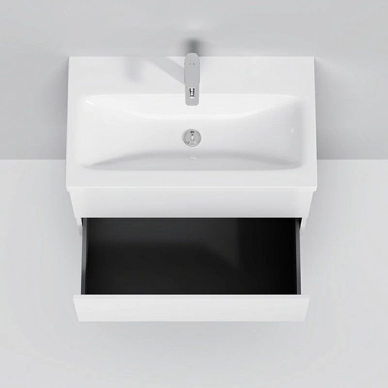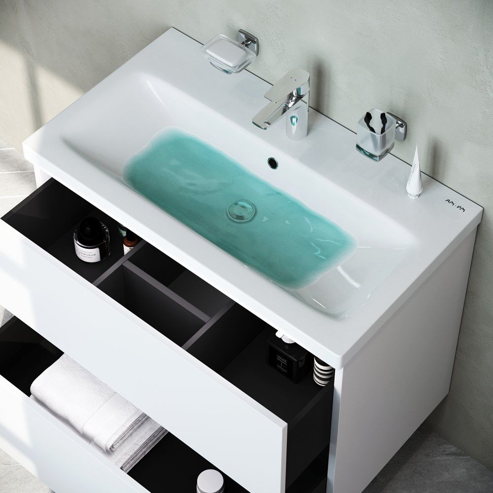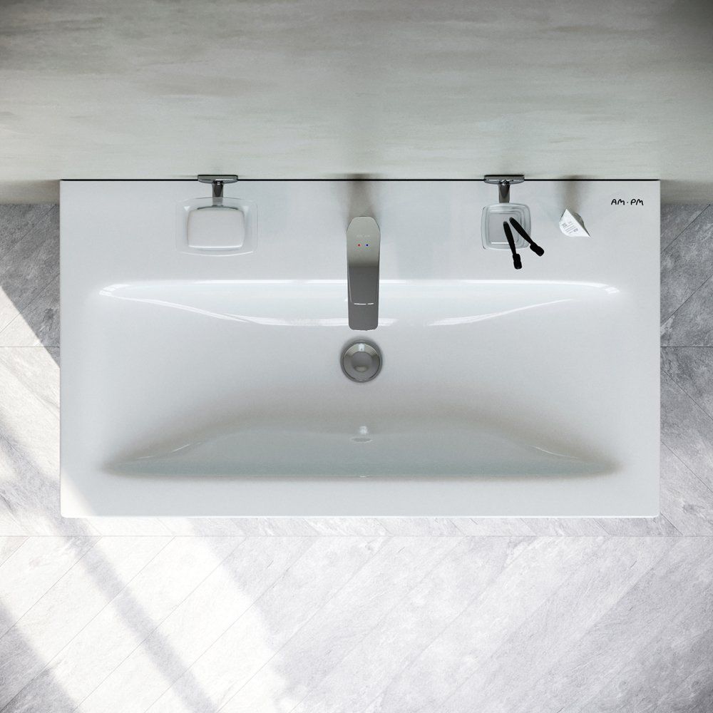 Фарфоровая раковина AM.PM Gem 75 размером 76x41,5 см интегрирована с устройством слив-перелив, для ее установки необходим донный клапан. Функциональная конструкция под один смеситель.
