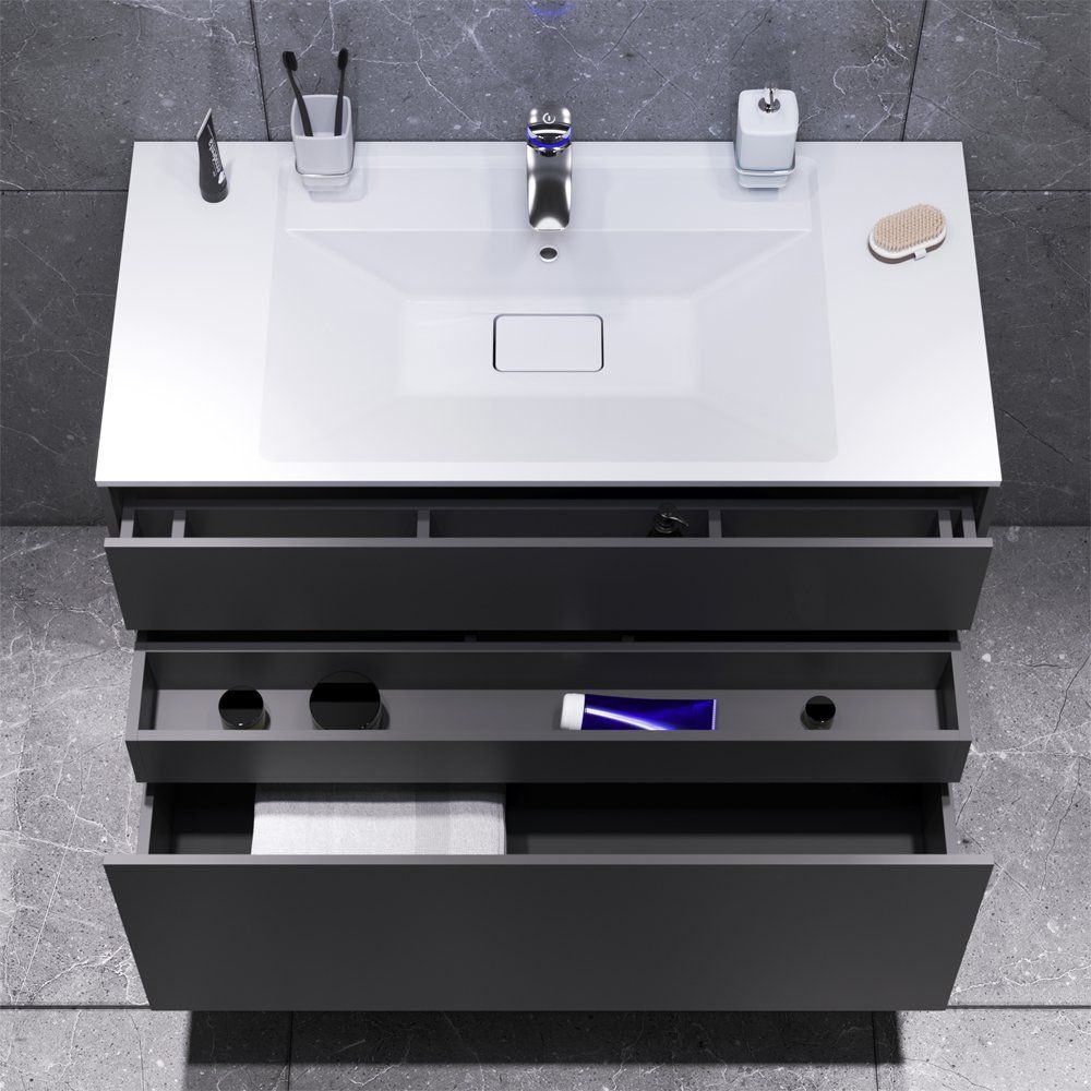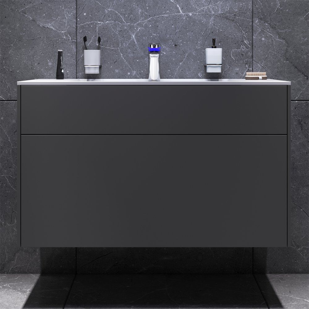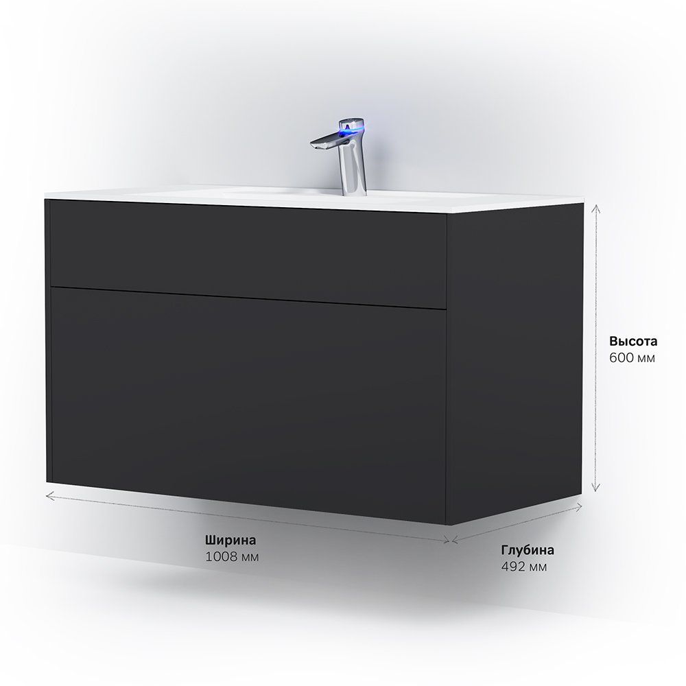 Тумба AM.PM Inspire V2.0 100 выполнена в графитовом матовом цвете и имеет габариты 100,4x49x60 см. Она подвесная, что экономит место и придает интерьеру легкость. Изделие из высококачественного МДФ, покрытого эмалью, обеспечивает долговечность и элегантность. Ящики оснащены механизмом плавного закрывания и системой push-to-open, благодаря чему открываются с помощью легкого нажатия на любую точку поверхности.
