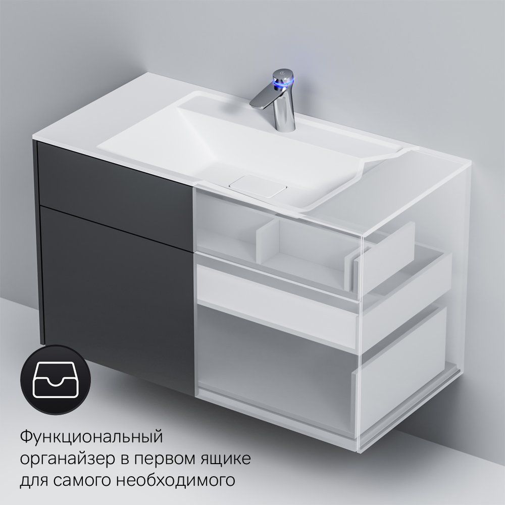 Тумба с раковиной AM.PM Inspire V2.0 100 в графите с матовым покрытием — это воплощение современных трендов в минималистическом дизайне. Ультратонкие грани, всего 12 мм, и четкие формы создают элегантный вид, который украсит любую ванную комнату. Уникальность этого изделия заключается в верхнем секретном ящике с органайзерами: откройте его всего на 12 см и используйте пространство максимально эффективно — ваши ежедневные процедуры станут комфортнее как никогда. Внутренний ящик скрывает мелкие вещи, а фурнитура последнего поколения с механикой push-to-open обеспечивает легкость и удобство в использовании.