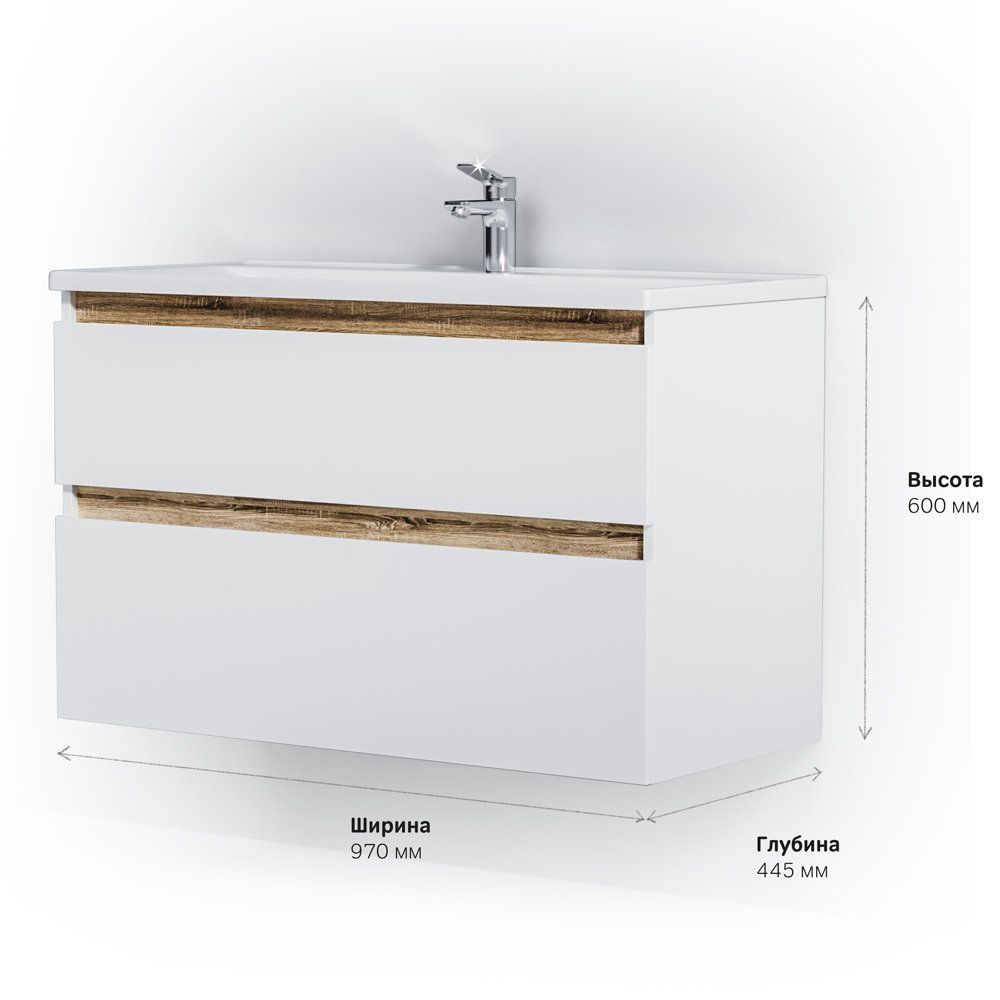 Комплект включает подвесную тумбу AM.PM X-Joy 100 с габаритами 97x44,5x60 см, выполненную из ЛДСП и МДФ с акриловым и эмалевым покрытием. Материал тумбы дополнительно защищен ламинатом, а механизм доводчика обеспечивает плавное закрывание ящиков. Раковина из фарфора размером 100x45 см оснащена встроенным слив-переливом и одним отверстием для смесителя. Немецкое качество подтверждается гарантией на тумбу в 3 года и 25 лет на раковину.