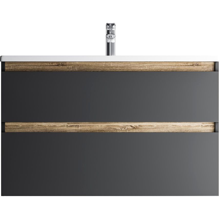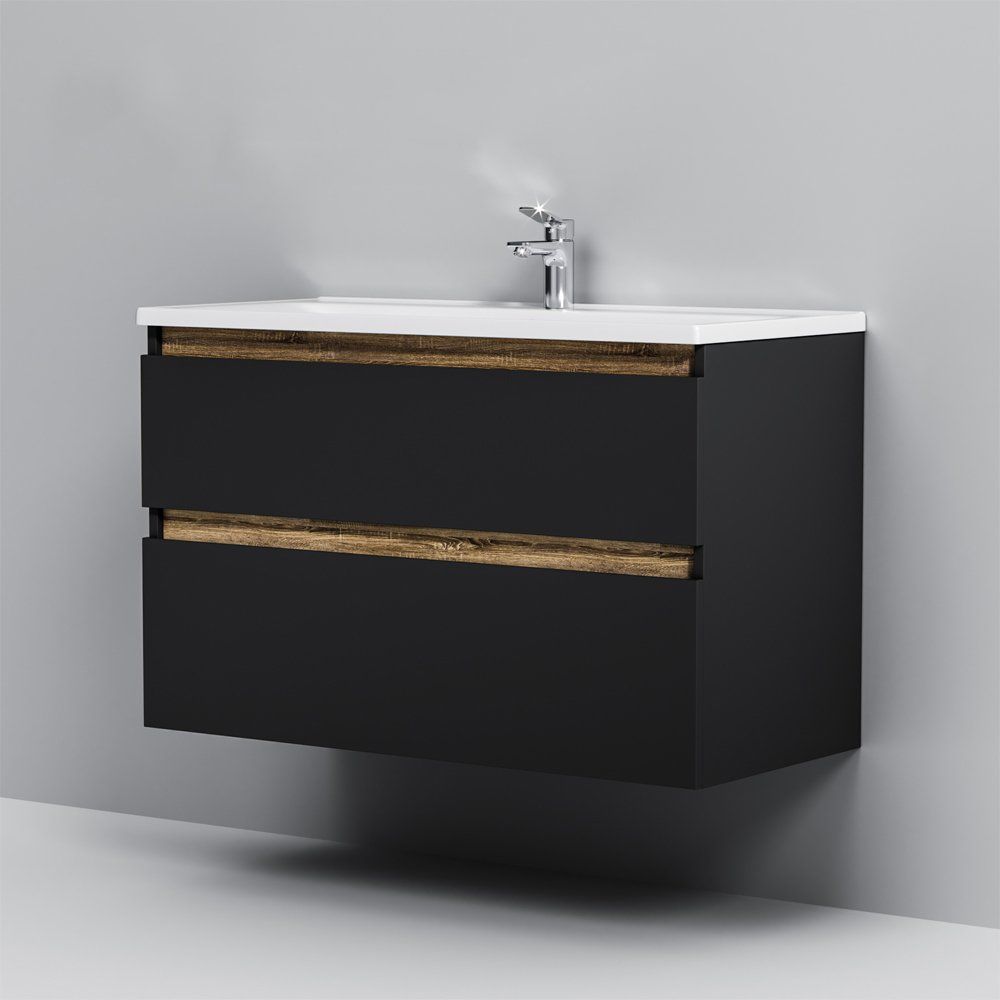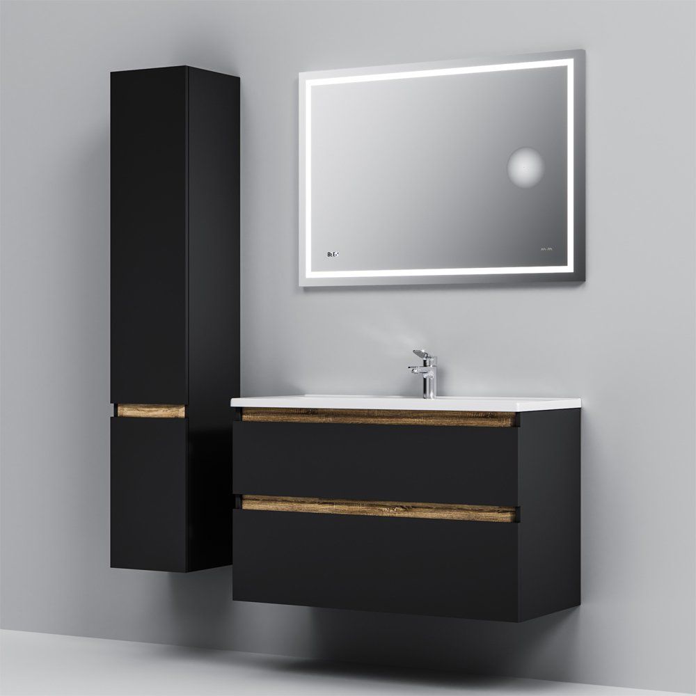 Тумба имеет габариты 97x44,5x60 см и изготовлена из высококачественного ЛДСП с матовым черным эмалированным покрытием. Фасады выполнены из МДФ, также покрашенными в стойкую эмаль. Подвесная конструкция оснащена ящиками с механизмом доводчика, что обеспечивает комфорт и бесшумность в использовании. Раковина из белого глянцевого фарфора размером 100x45 см снабжена встроенным сливом-переливом и одним отверстием под смеситель. Для раковины подходит сифон диаметром 3.2 см, однако донный клапан необходимо приобрести отдельно. Продукт произведён в Германии и обладает гарантией 3 года на тумбу и 25 лет на раковину.