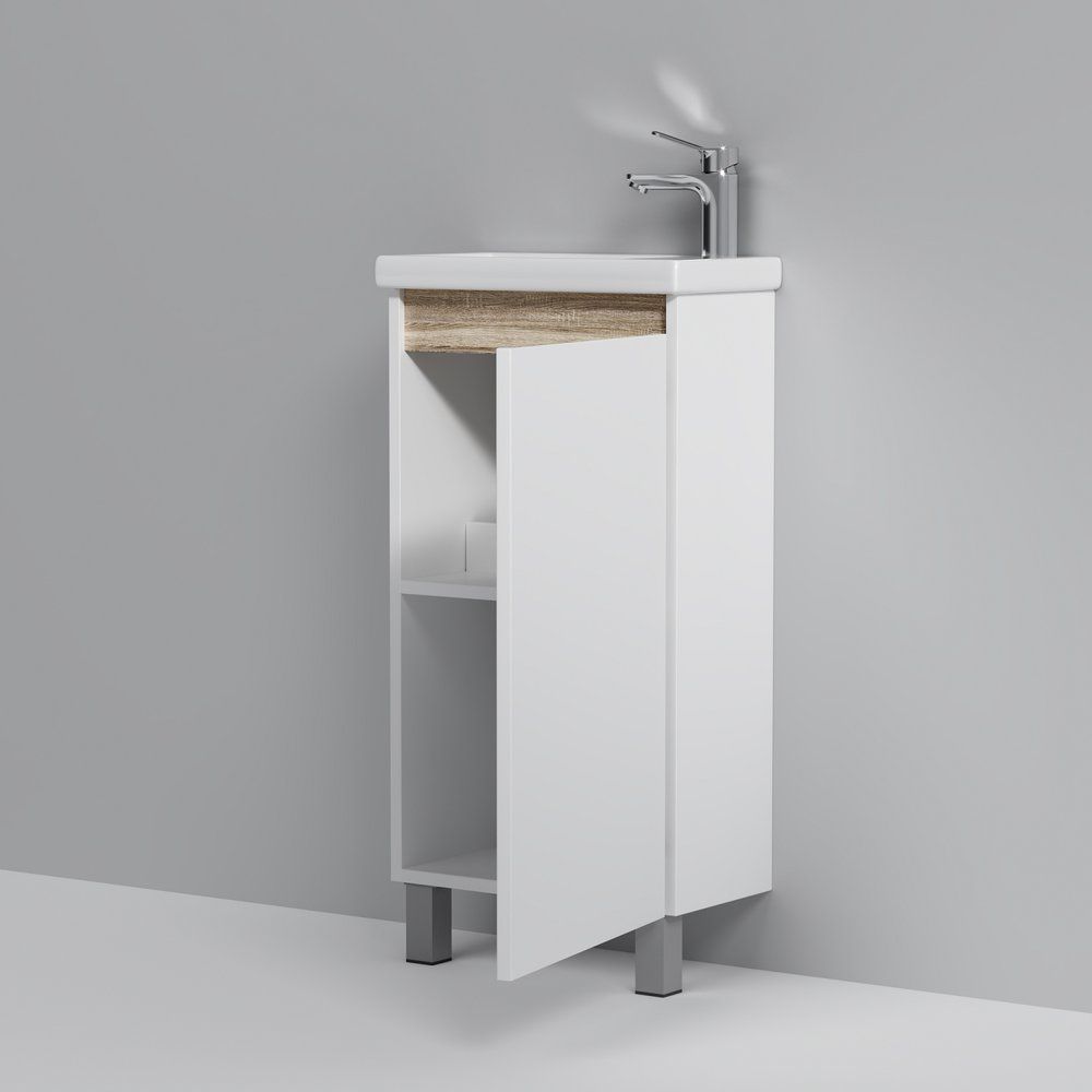 Тумба AM.PM X-Joy 45 выполнена в белом глянце и имеет габариты 42,5x24,8x81 см. Она крепится к стене и дополнительно опирается на ножки. Механизм доводчика обеспечивает плавное закрывание дверок. Корпус изготовлен из ЛДСП/ДСП с ламинатным покрытием, а фасады из МДФ покрыты акрилом и эмалью. Внутренние полки съемные для удобной организации пространства. Рукомойник X-Joy, выполненный из фарфора, имеет габариты 44x25 см. Слив-перелив и одно отверстие под смеситель входят в комплект, но донный клапан приобретается отдельно.