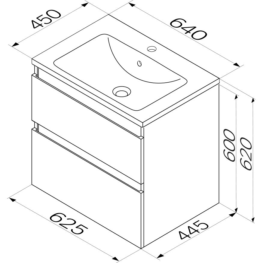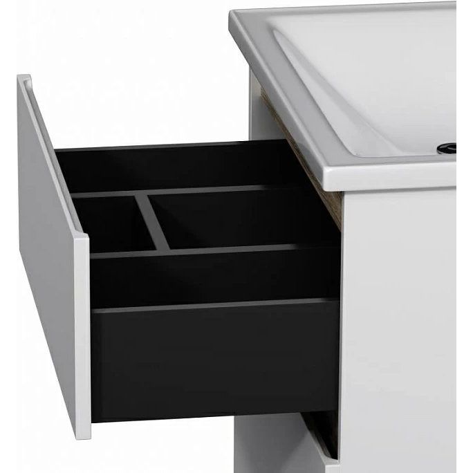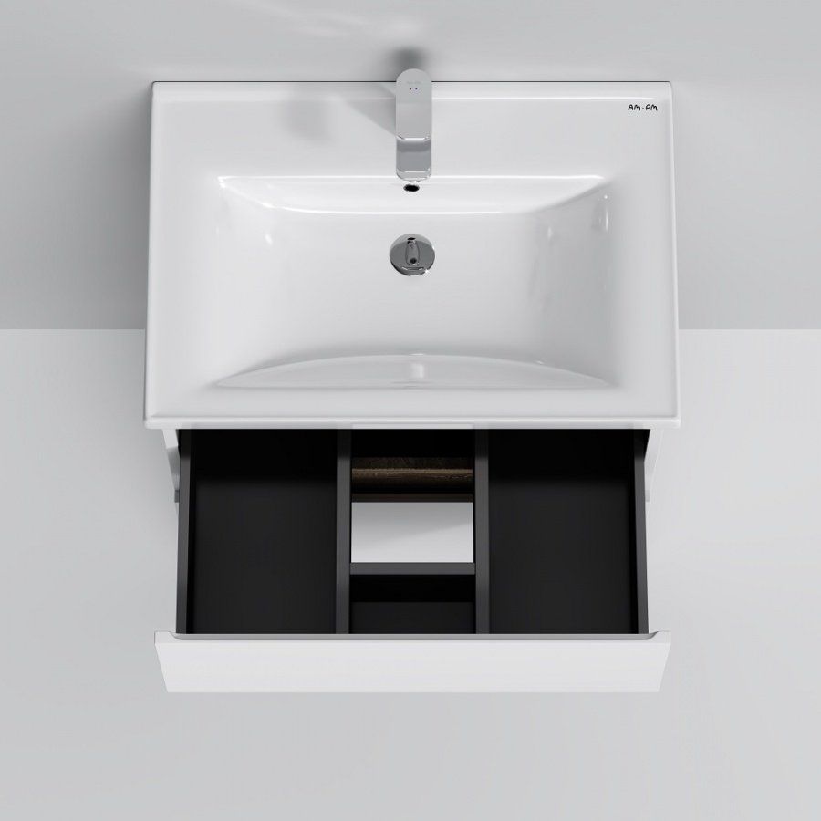 Тумба для комплекта AM.PM X-Joy 65 подвесного типа имеет размеры 62,5x44,5x60 см и оснащена механизмом доводчика для плавного закрывания. Корпус выполнен из ЛДСП/ДСП с ламиновым покрытием, а фасады – из МДФ, покрытые акриловой эмалью. Ящики внутри – антрацитовые с противоскользящим покрытием. Также в комплекте идет мебельная раковина из фарфора размером 64x45 см с одним отверстием под смеситель и встроенным сливом-переливом.