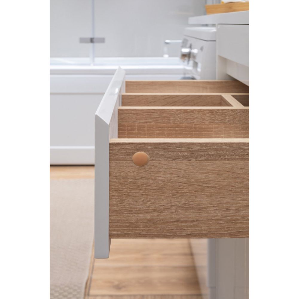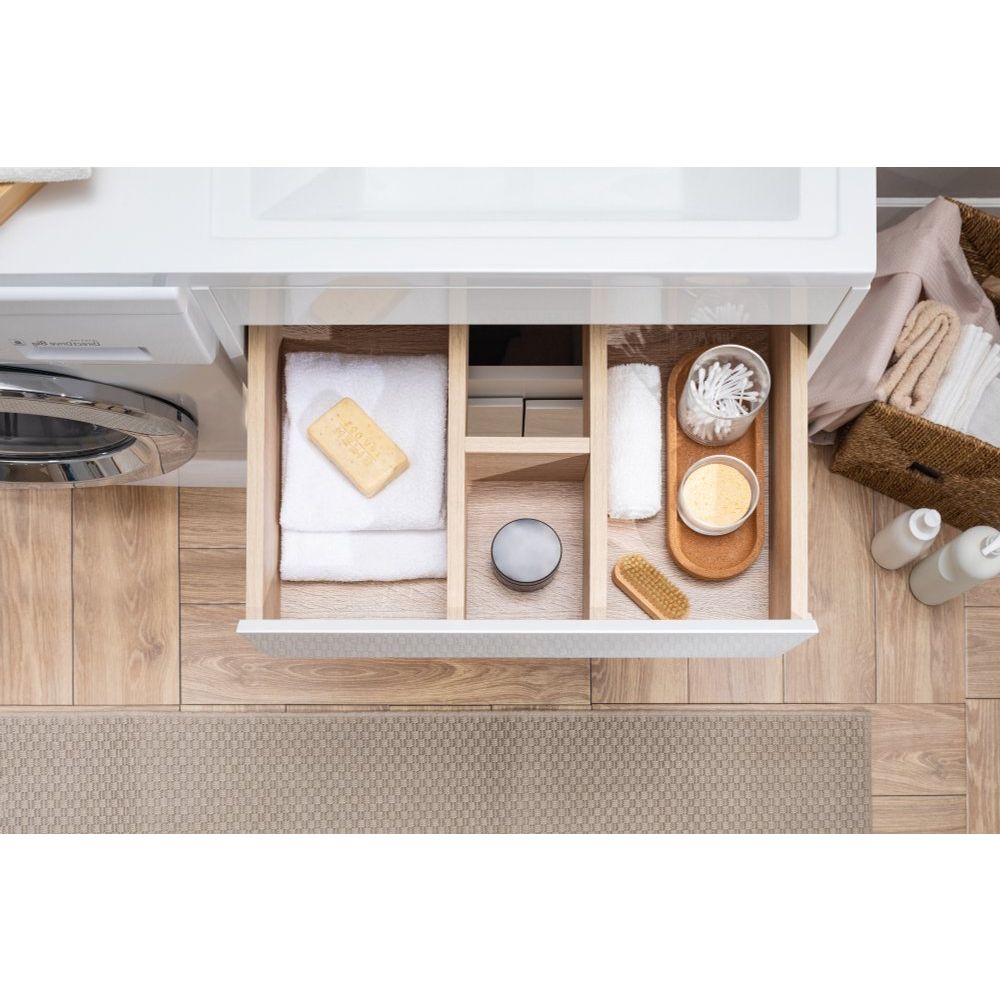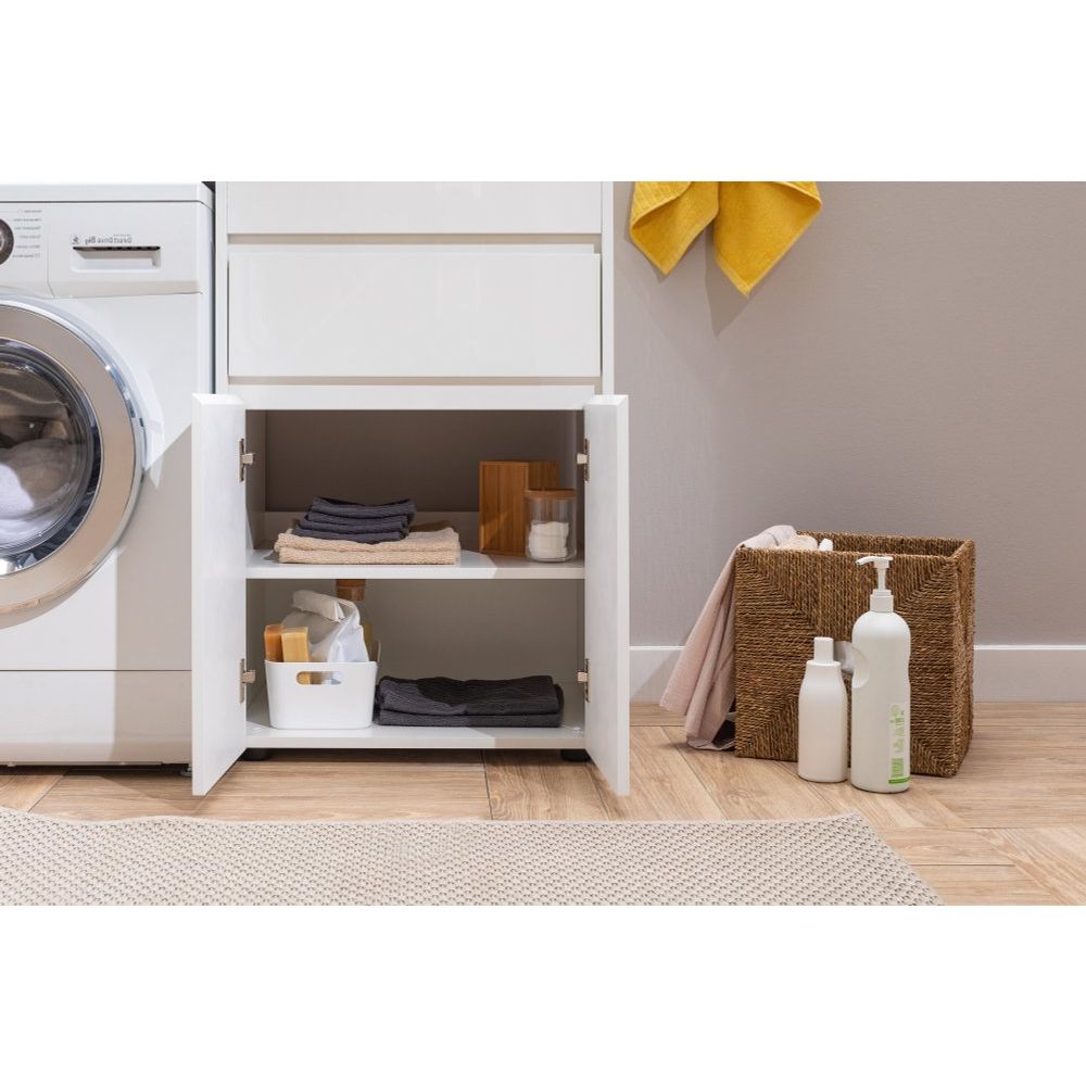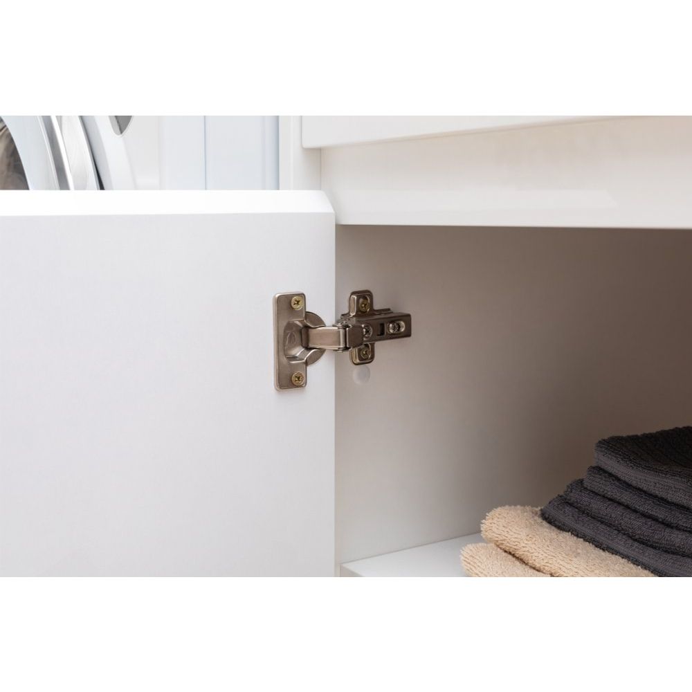 Тумба включает в себя один ящик и две двери, предлагая оптимальные размеры для хранения и использования: ширина 48 см, глубина 47,5 см, высота 81,5 см. Модель напольная, оснащена механизмом доводчика. Корпус выполнен из ламинированного ЛДСП, а фасады — из эмалированного МДФ, что гарантирует представительный внешний вид и стойкость к воздействию влаги. Рассчитана для установки над стиральной машиной.