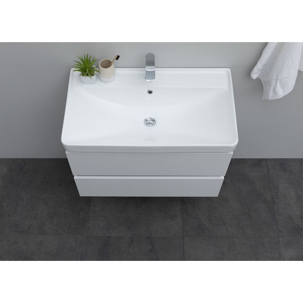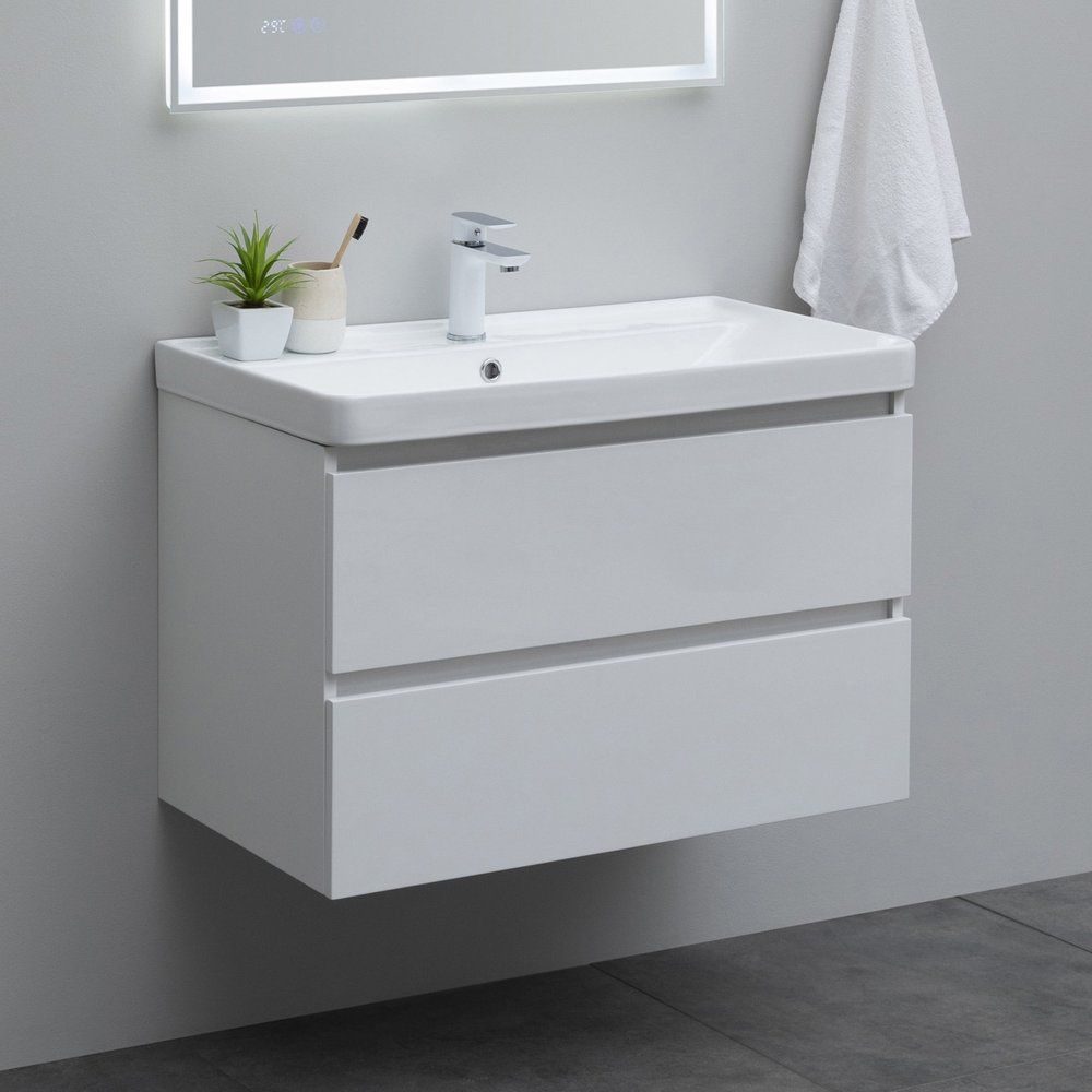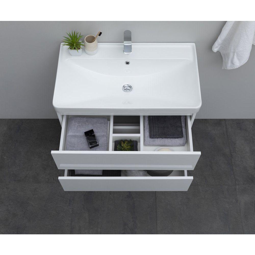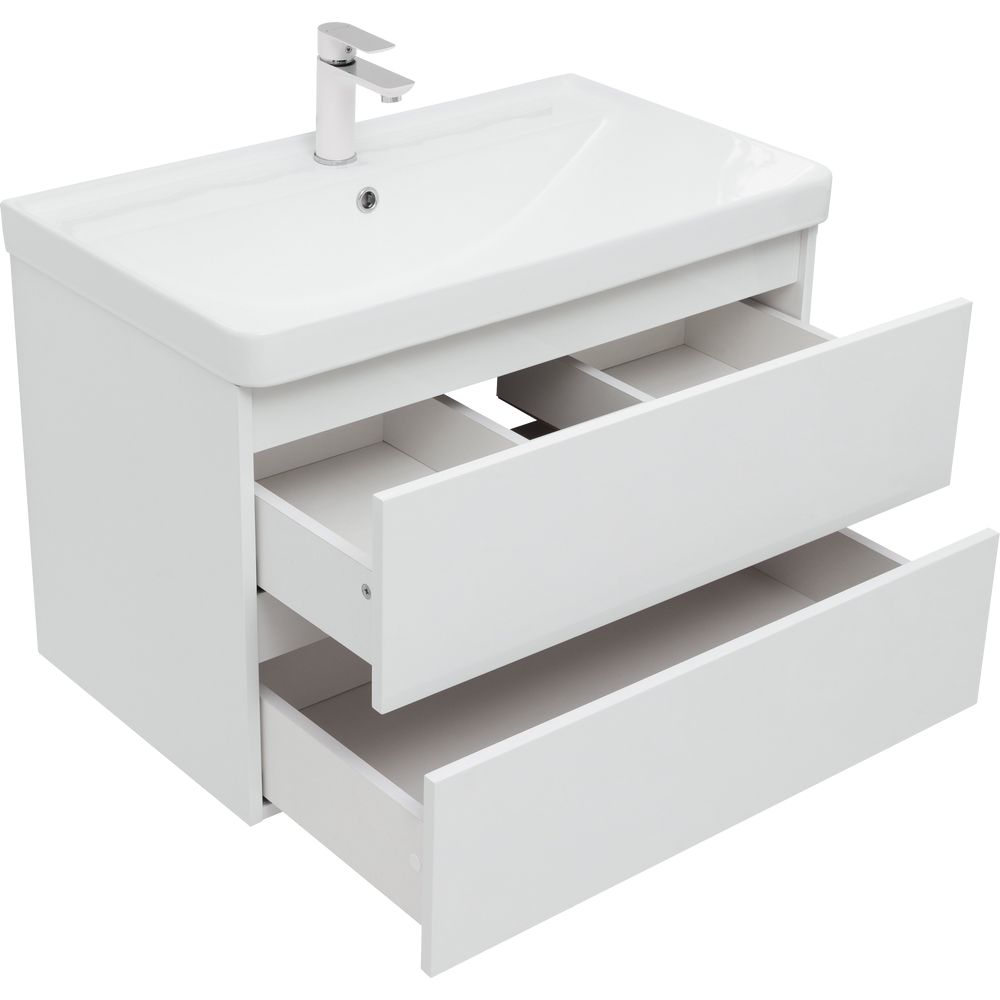 Тумба Aquanet Вега, шириной 79,4 см, глубиной 45,9 см и высотой 50,2 см, изготавливается в подвесной версии, что позволяет освободить пространство на полу. Мягкое закрывание ящиков осуществляется благодаря встроенному механизму доводчика. Корпус и фасад выполнены из ЛДСП с покрытием из эмали и ламината, что обеспечивает стойкость к влаге и механическим повреждениям.