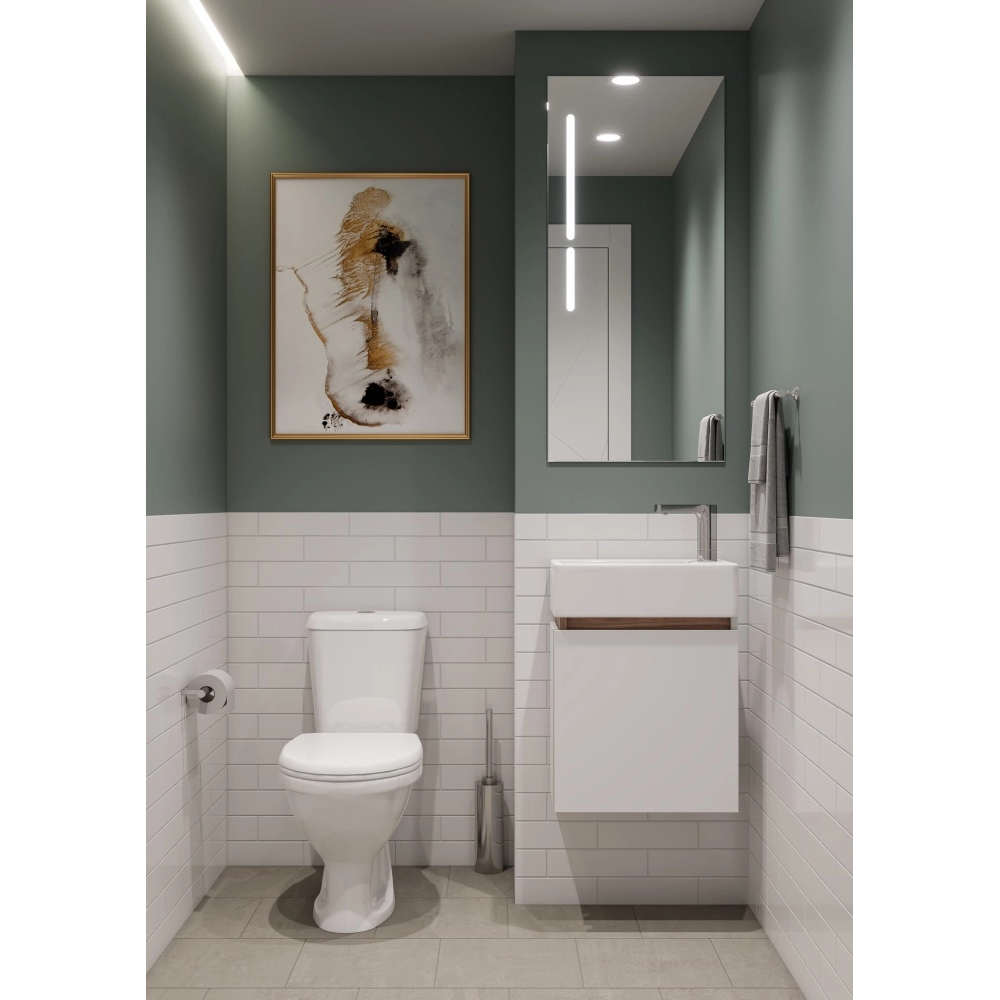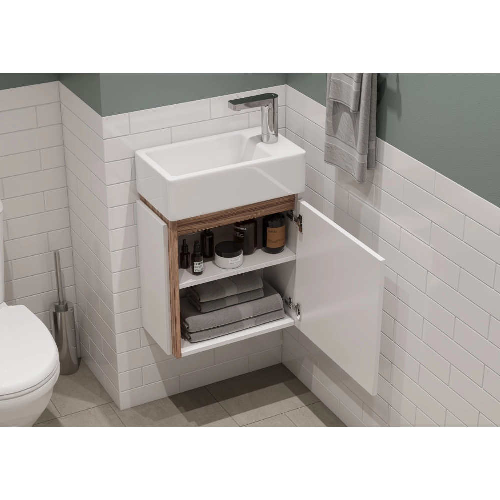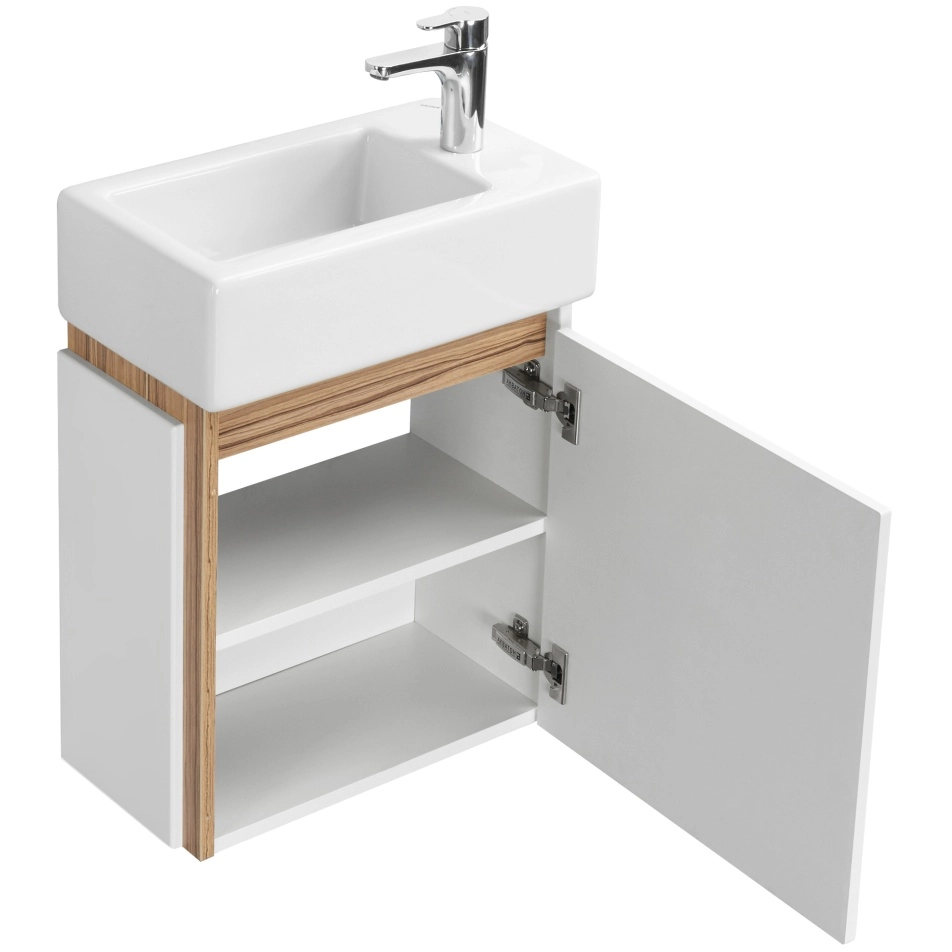 Правосторонняя тумба Эклипс М от AQUATON позволит грамотно организовать небольшой санузел или ванную комнату. Корпус у данной модели комбинированный и изготовлен из текстурированной ДСП в эффектной светлой отделке эбони и из влагостойкой ЛДСП, покрытой глянцевой белой краской. Фасад, выполненный из МДФ, также окрашен в белый глянец. Минималистичный дизайн тумбы подчеркивает отсутствие лицевой фурнитуры. Плавное закрывание распашного фасада-створки обеспечивают петли с доводчиком. Для комплектации тумбы Эклипс М подойдет компактная, но при этом глубокая прямоугольная керамическая раковина Santek Эрис 46.