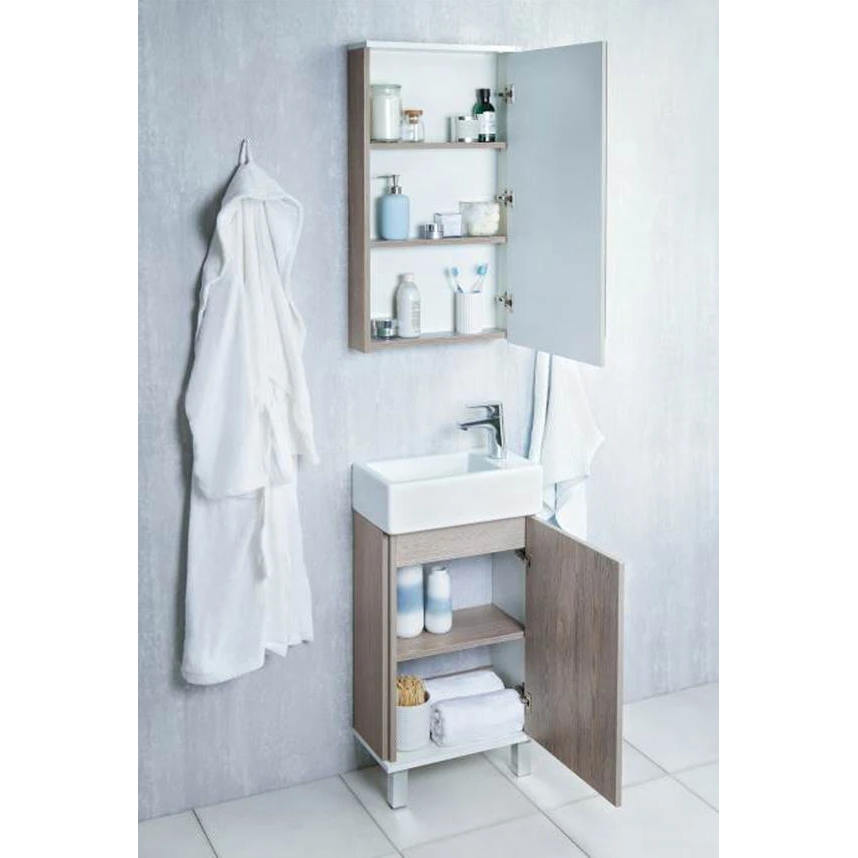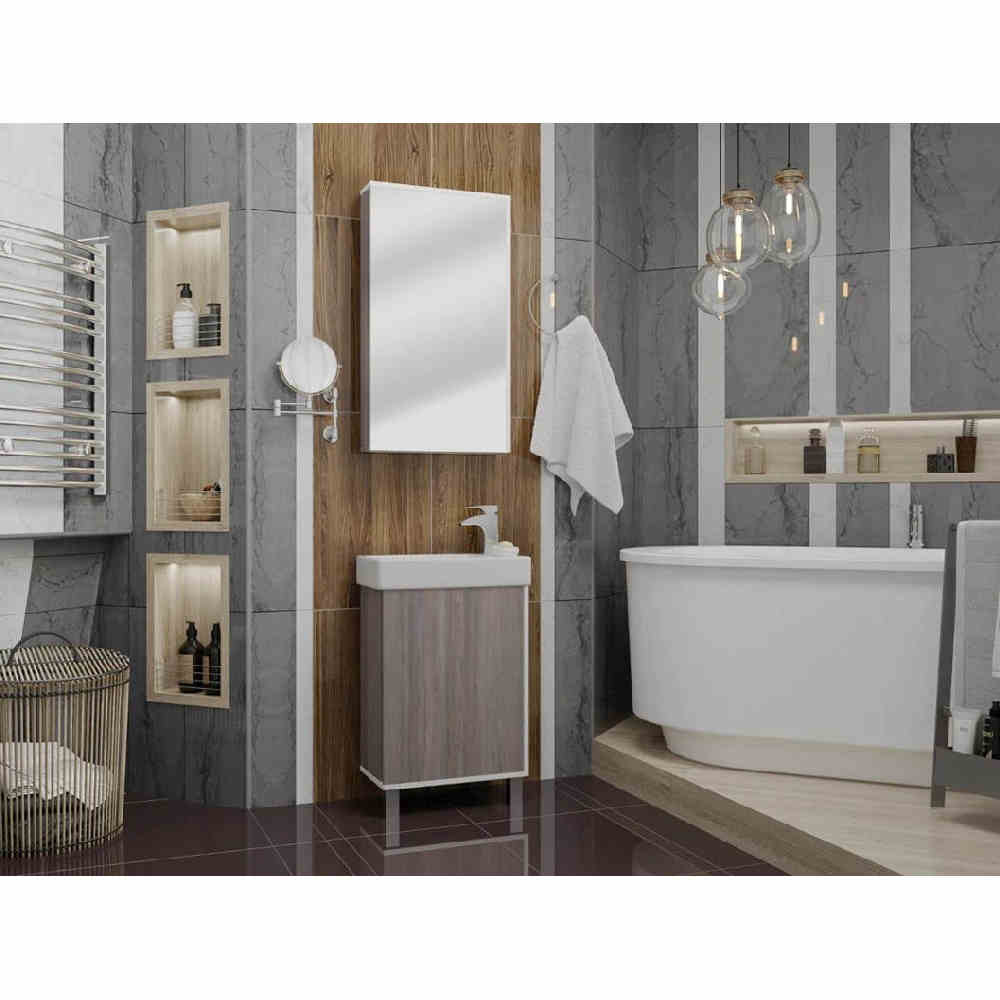 Стильная и элегантная тумба Эмма от AQUATON отлично подходит для ванных комнат и санузлов с компактными габаритами. Передний фасад, левая боковая стенка, а также регулируемая по высоте внутренняя полка выполнены из влагостойкой ЛДСП в цвете дуб наварра. Правая боковая стенка из влагостойкой ЛДСП покрашена в белый глянец. Полное отсутствие лицевой фурнитуры поддерживает минималистичный дизайн модели. Для комплектации тумбы идеально подходит прямоугольная раковина Santek Эрис 46.ЛДСП цвета «дуб наварра», правая боковая стенка - из крашенной белой глянцевой влагостойкой ДСП. Левая боковая стенка зеркального шкафа продолжает линию тумбы и также выполнена в цвете «дуб наварра». В нижней части зеркального.