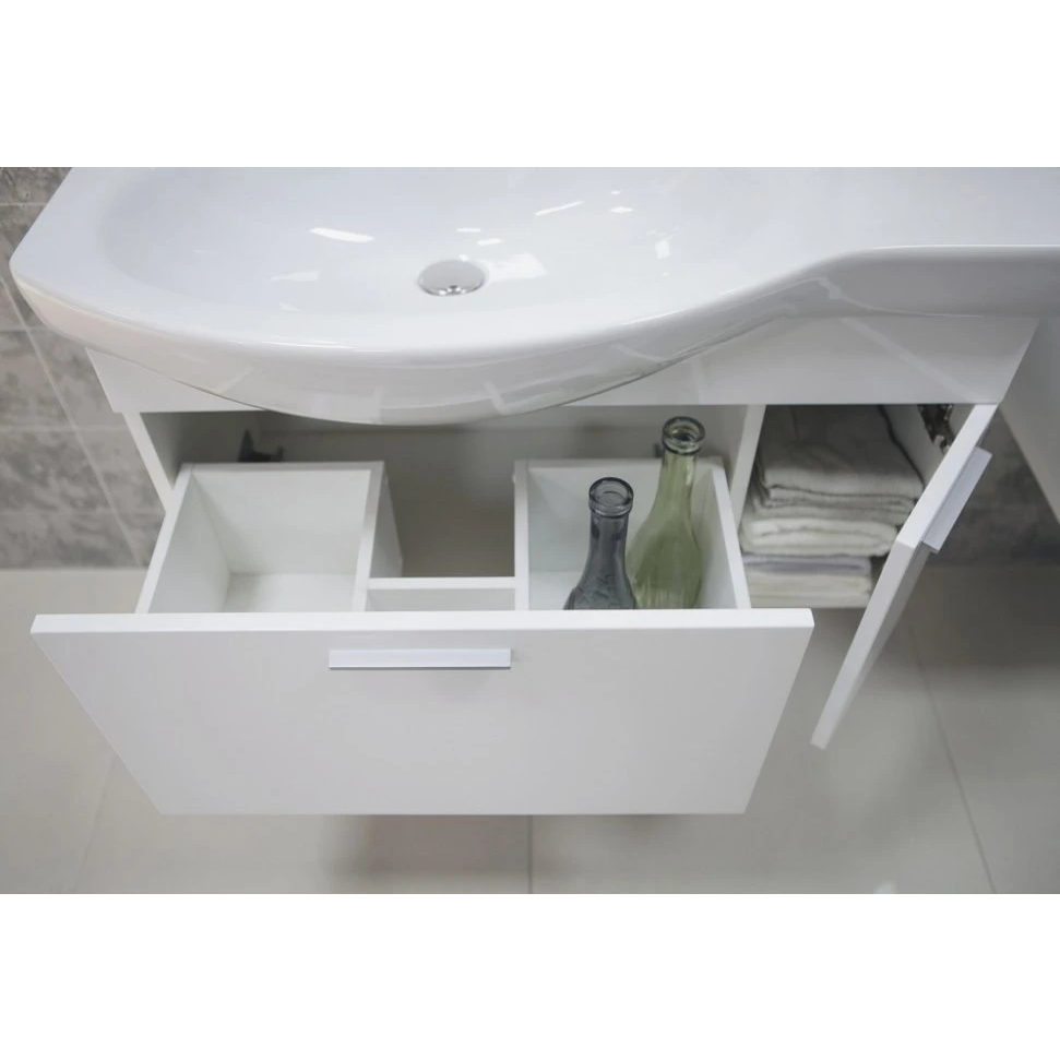 Тумба Инди 80 от AQUATON создана для тех, кто ценит комфорт и лаконичный дизайн. Модель вместительна и функциональна: глубина ящиков позволяет без труда размещать высокие бутылочки и баночки, а встроенный механизм плавного закрывает обеспечивает мягкий и бесшумный ход ящика. За створкой фасада - дополнительное место для хранения. Тумба комплектуется керамической раковиной сложной формы Santek